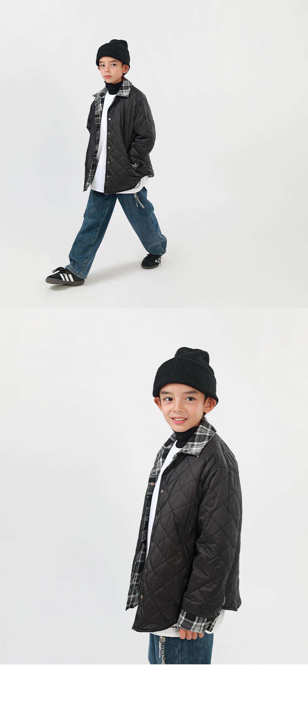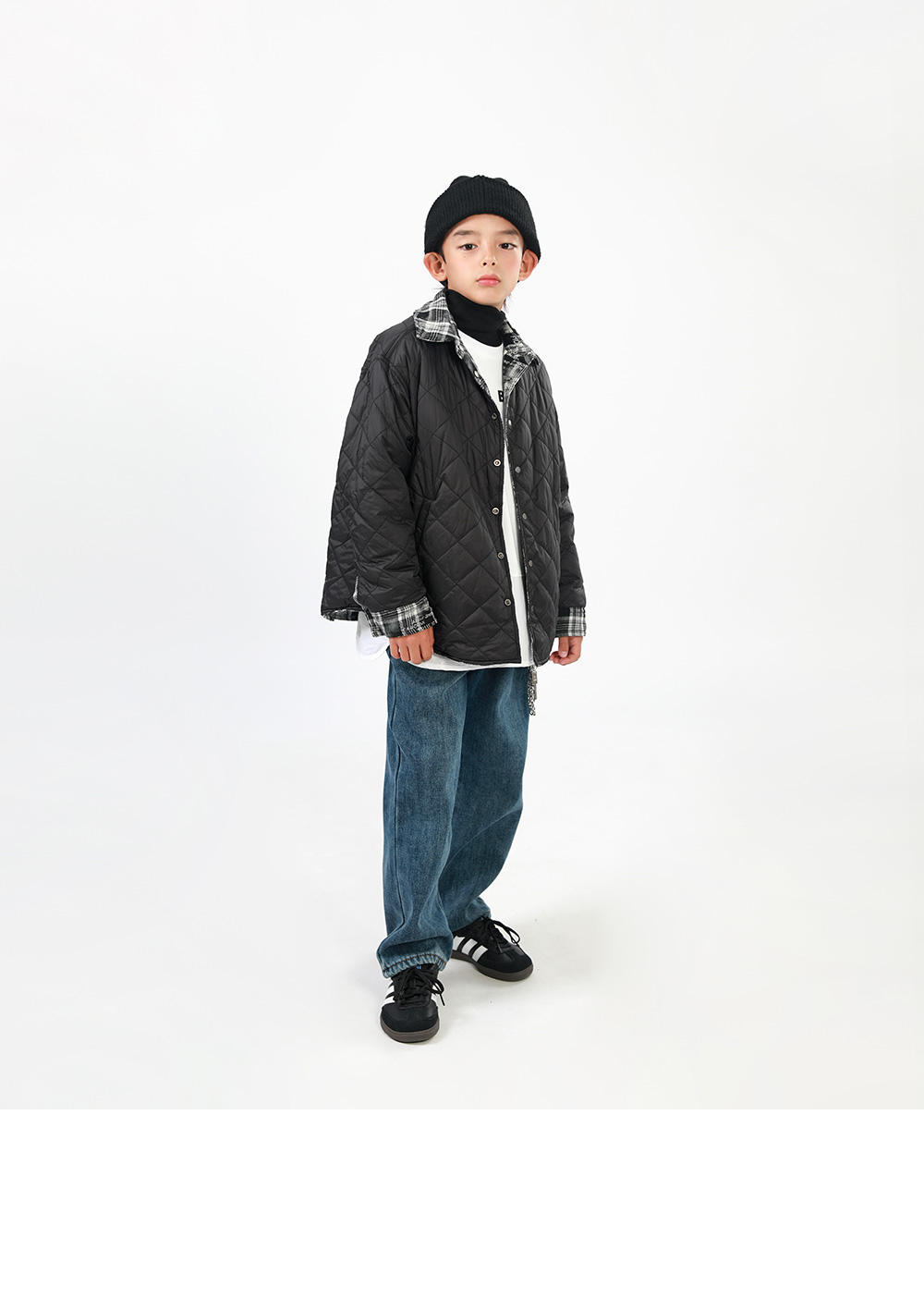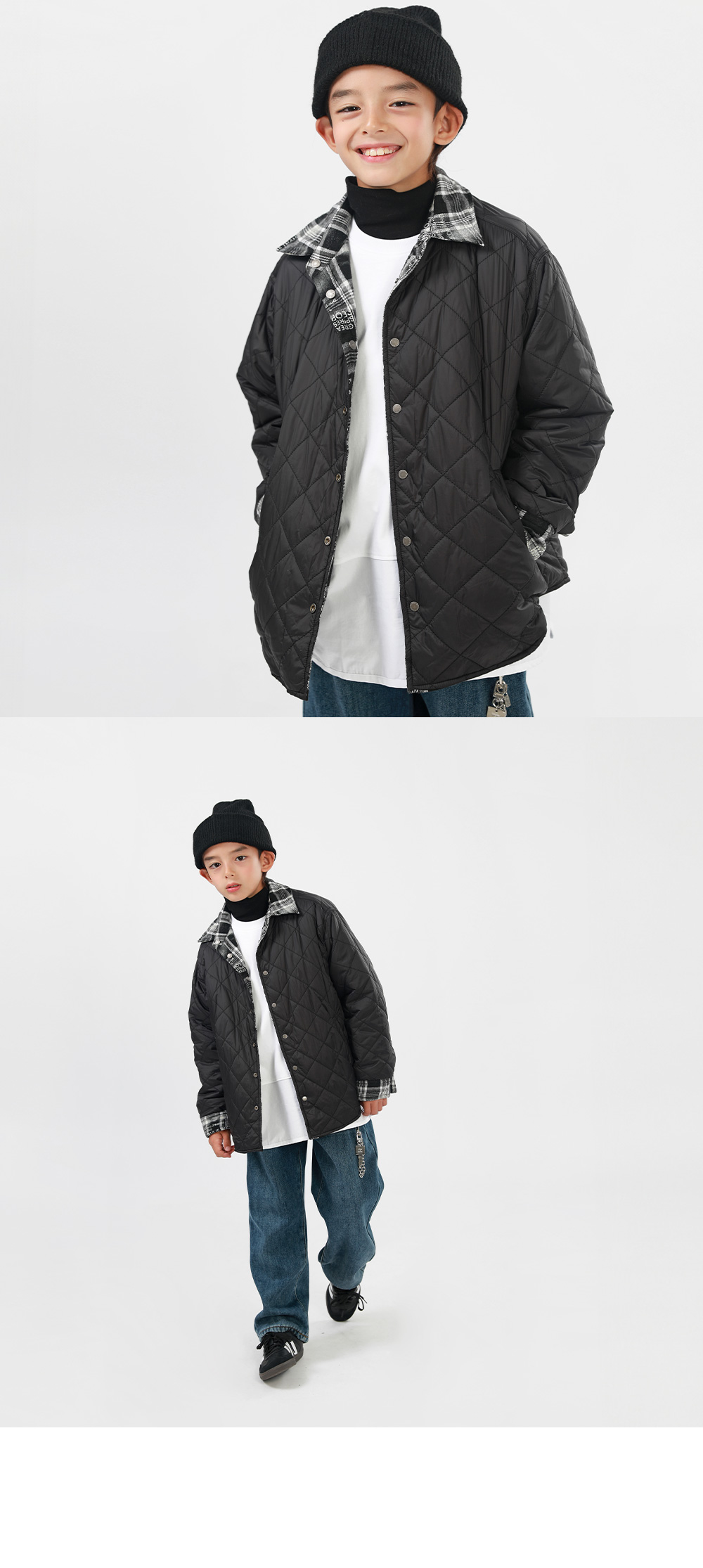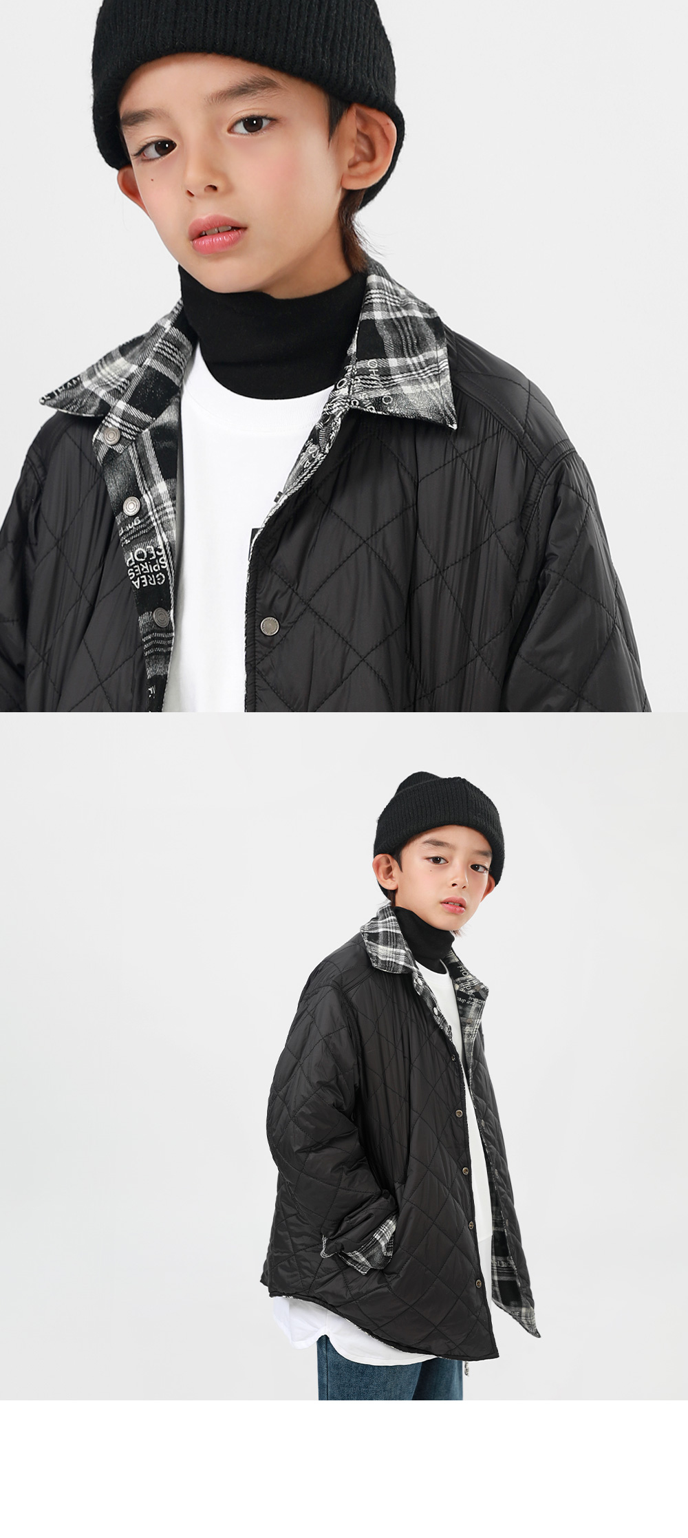 This is a reversible jacket that can be styled with a check pattern or quilted cotton with lettering added according to your taste. It is good to wear anywhere in black color, and it is easy for children to wear it on their own with snap buttons.