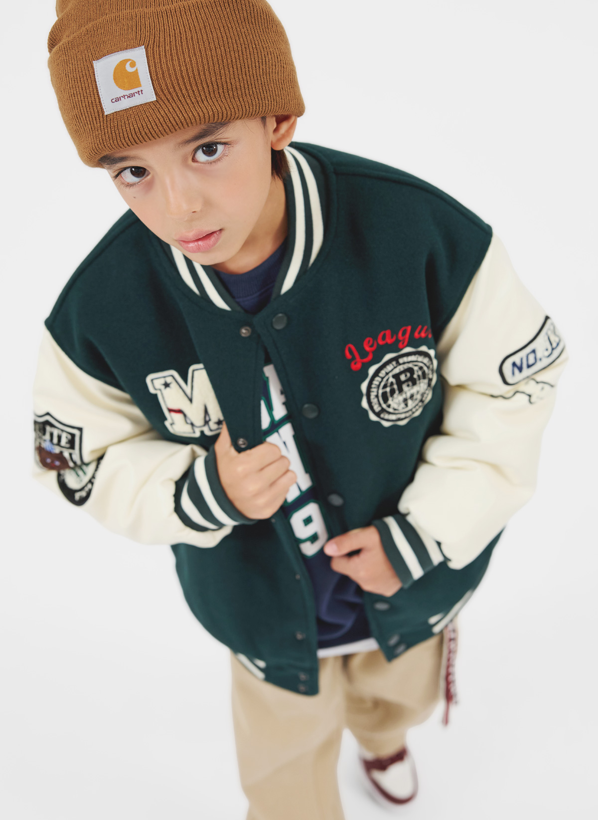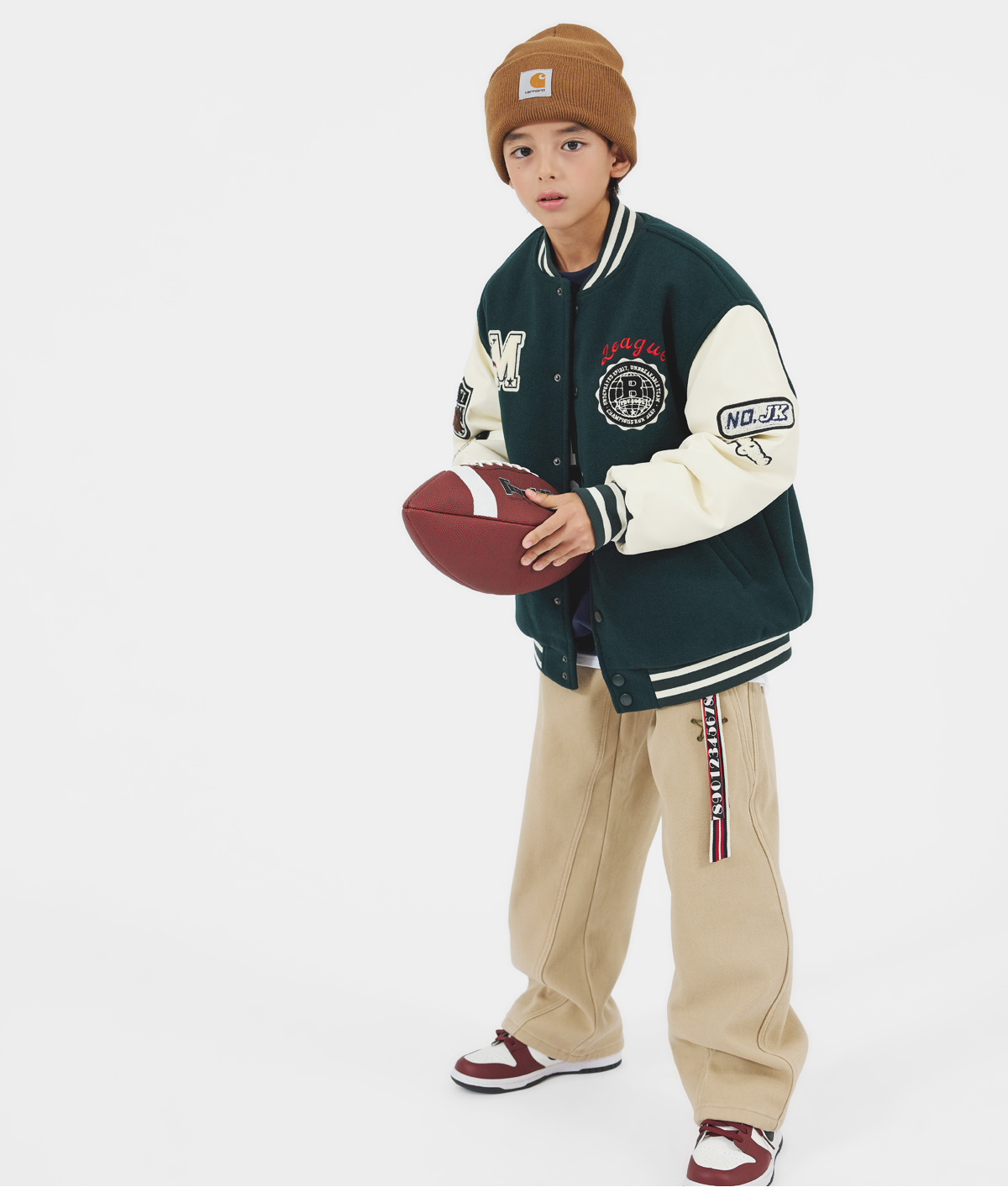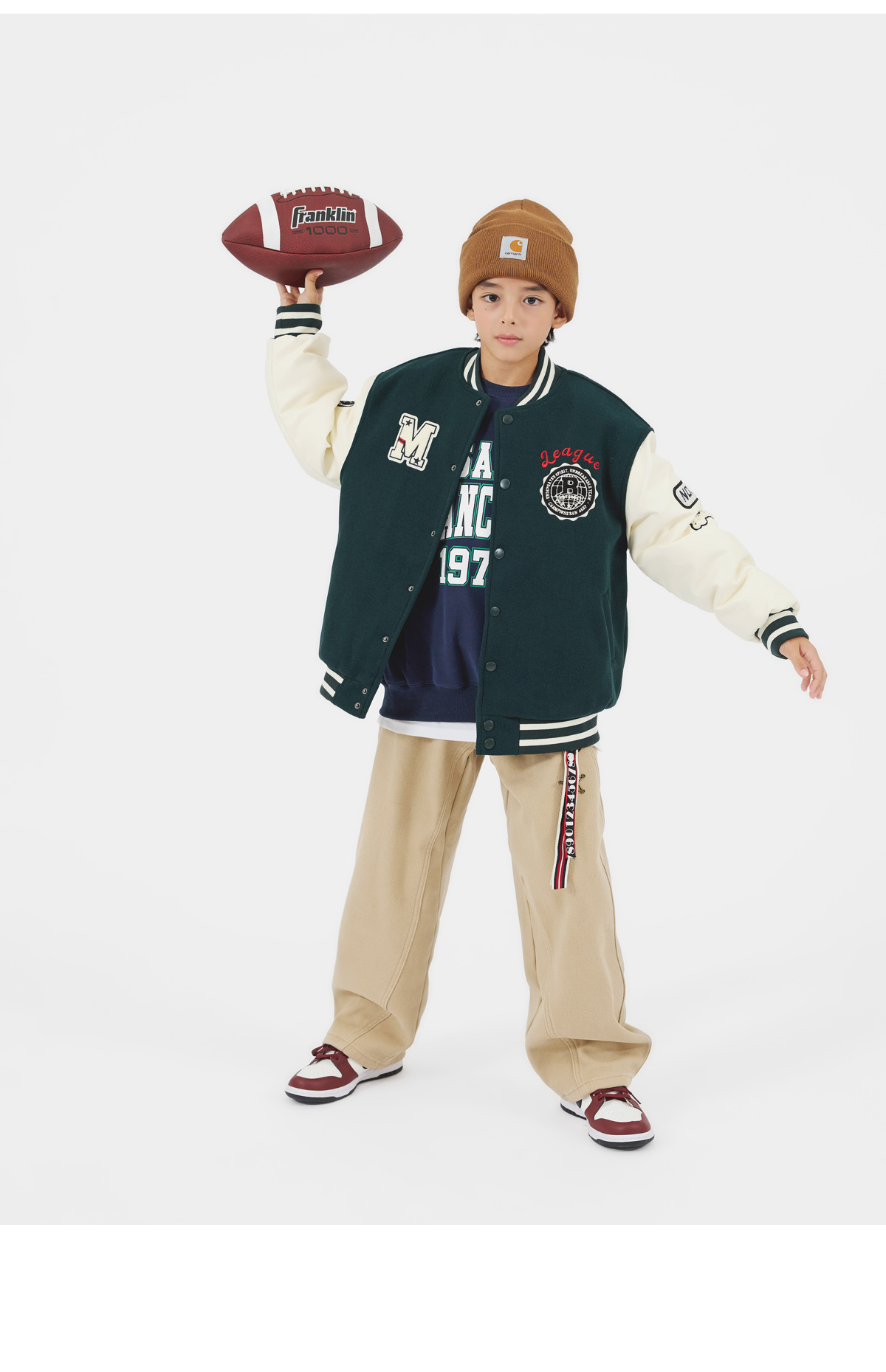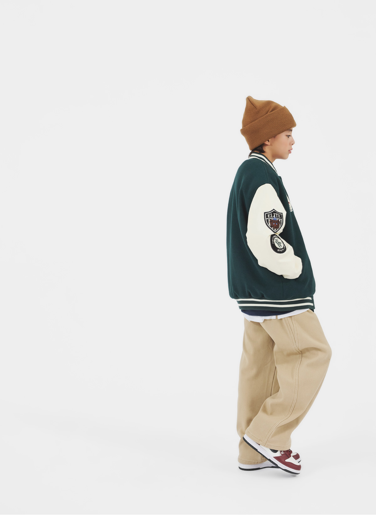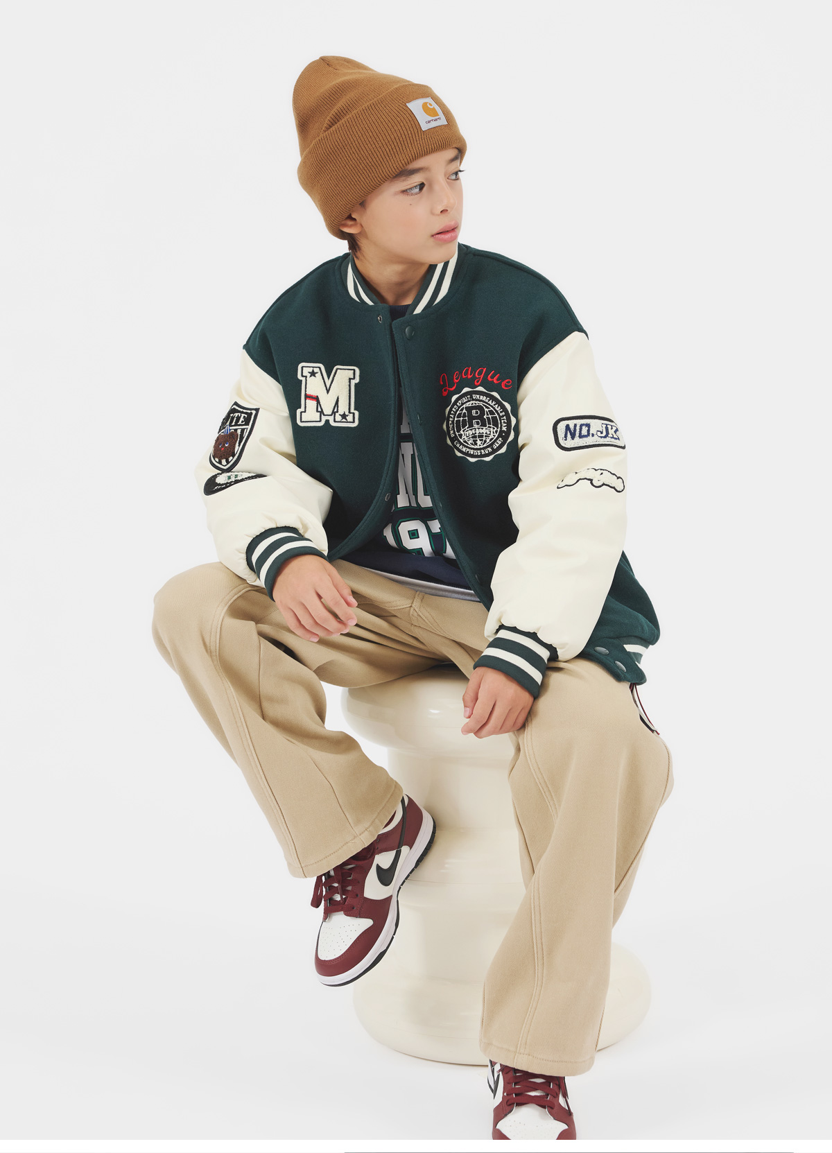 딥그린 바디와 아이보리 소매 배색이 멋스러운 퀼팅 점퍼예요.