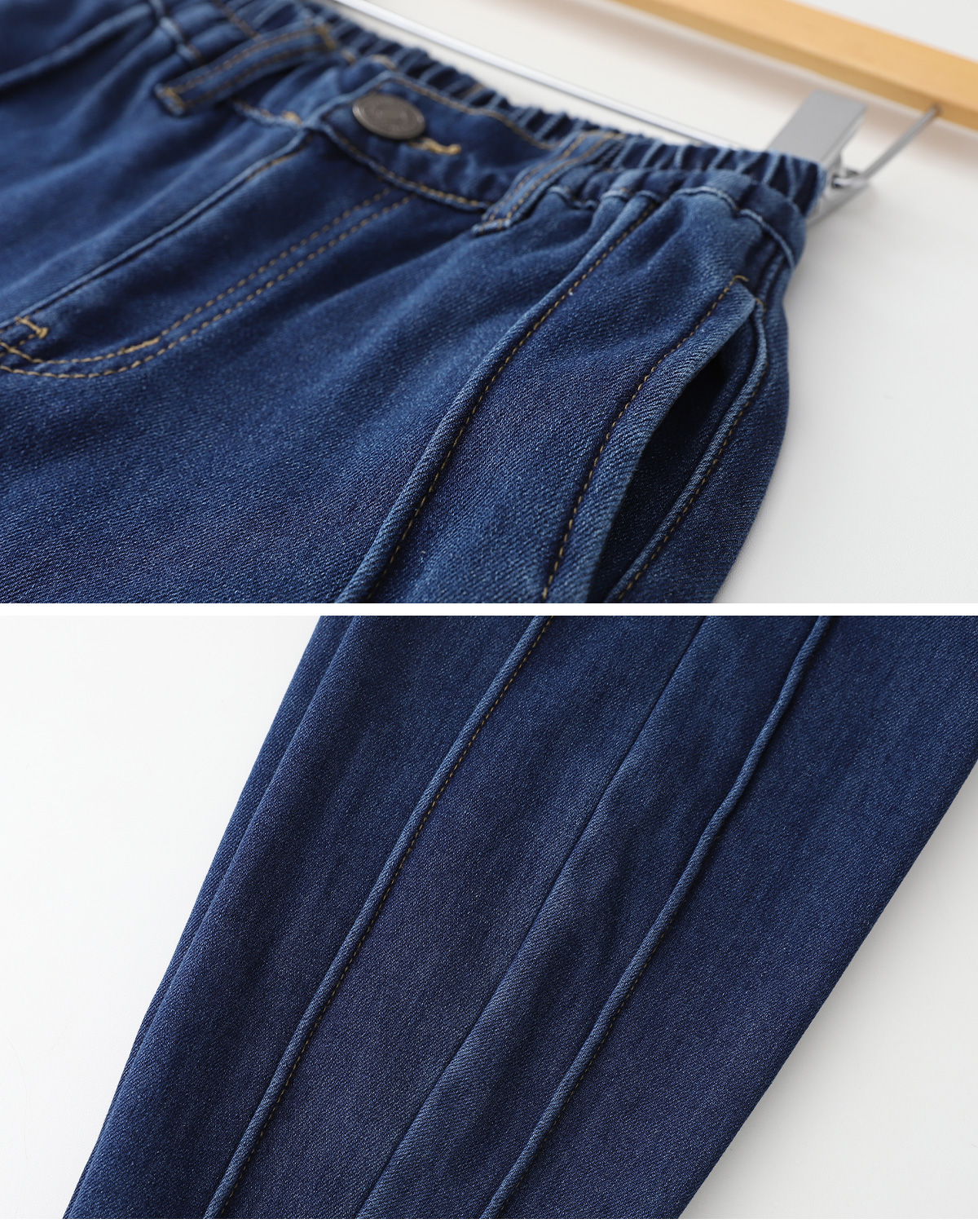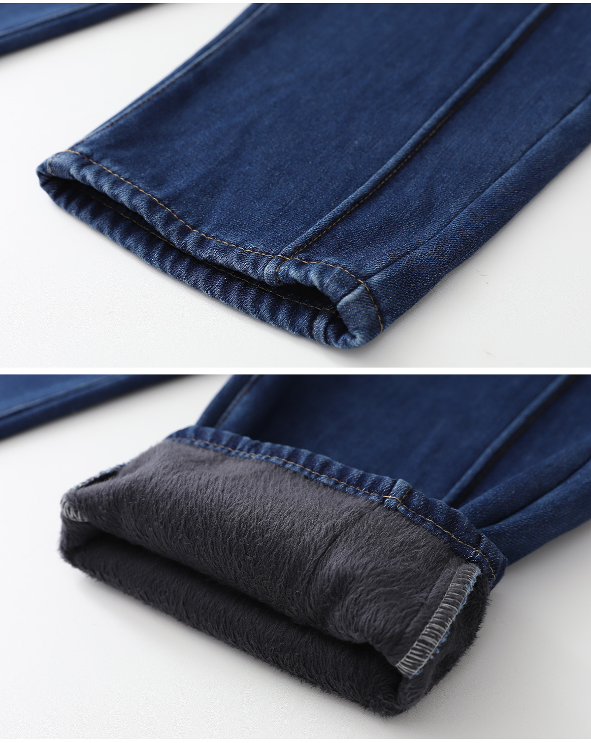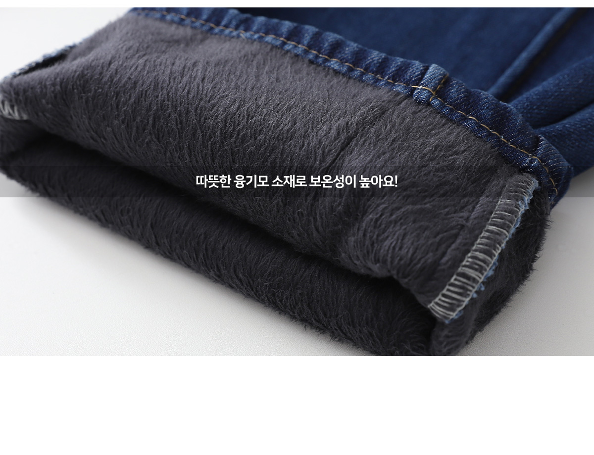도톰한 융기모 안감으로 한겨울까지 따뜻하게 입을 수 있는 데님 팬츠예요.