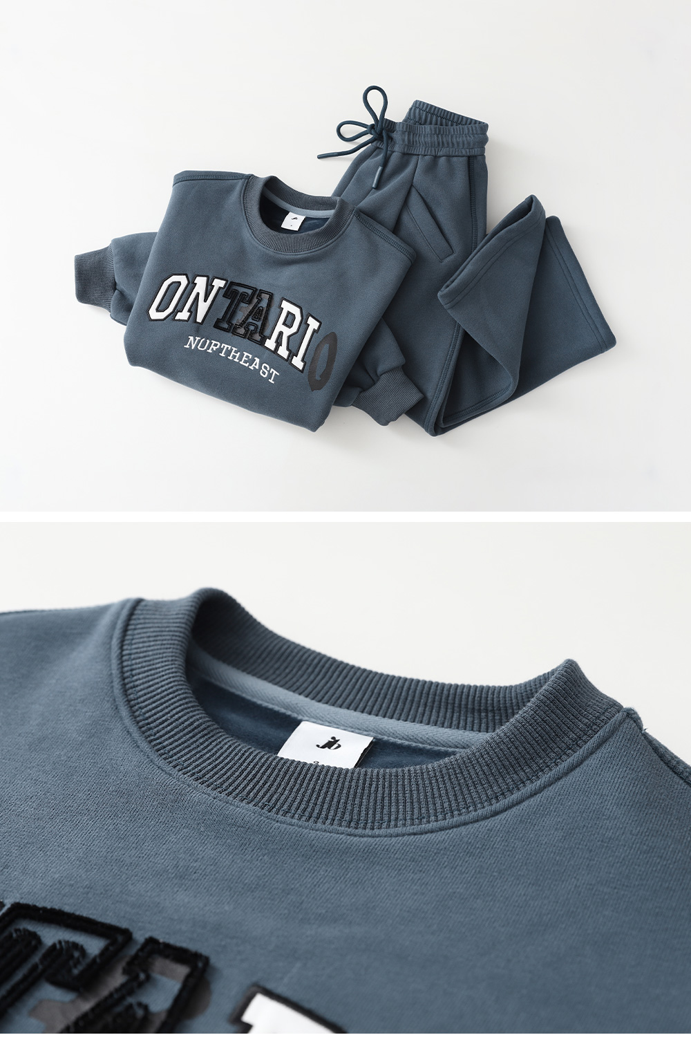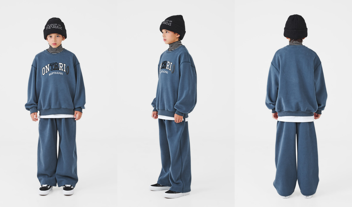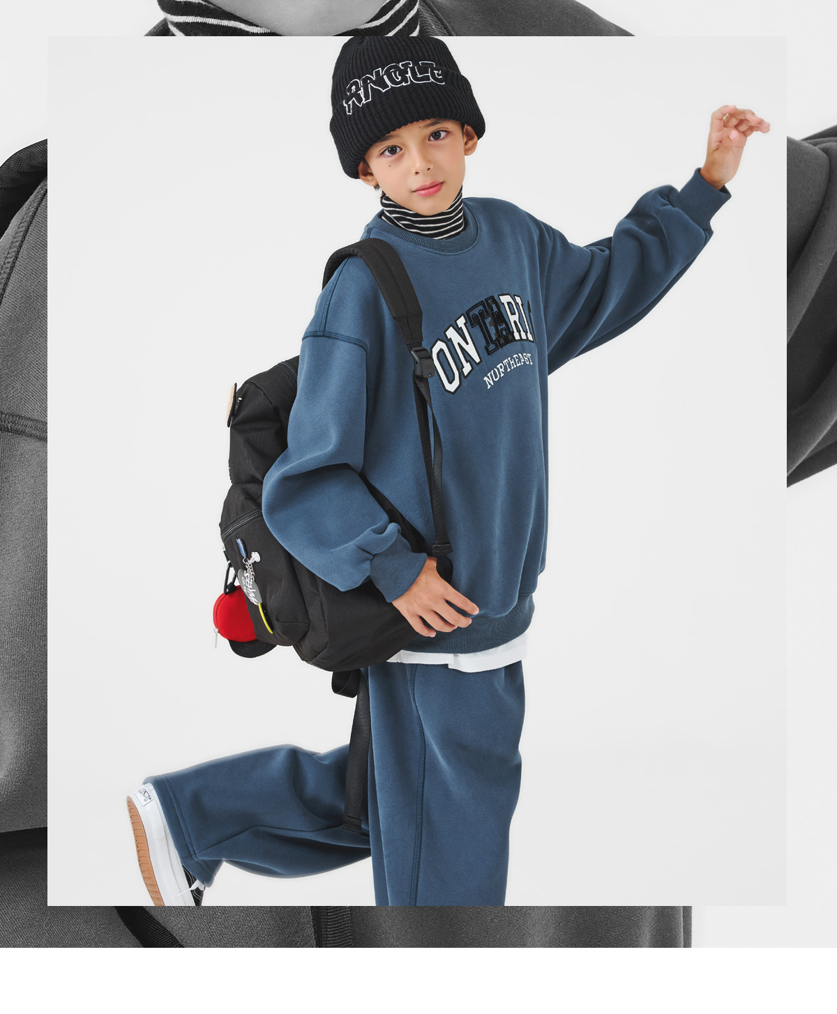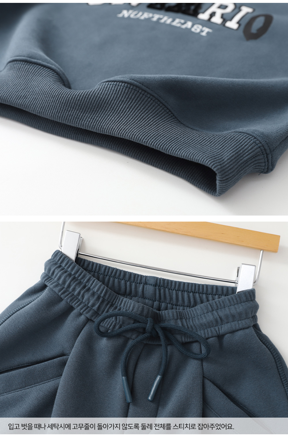 빈티지한 워싱 컬러와 프론트 레터링이 돋보이는 기모 상하세트예요.