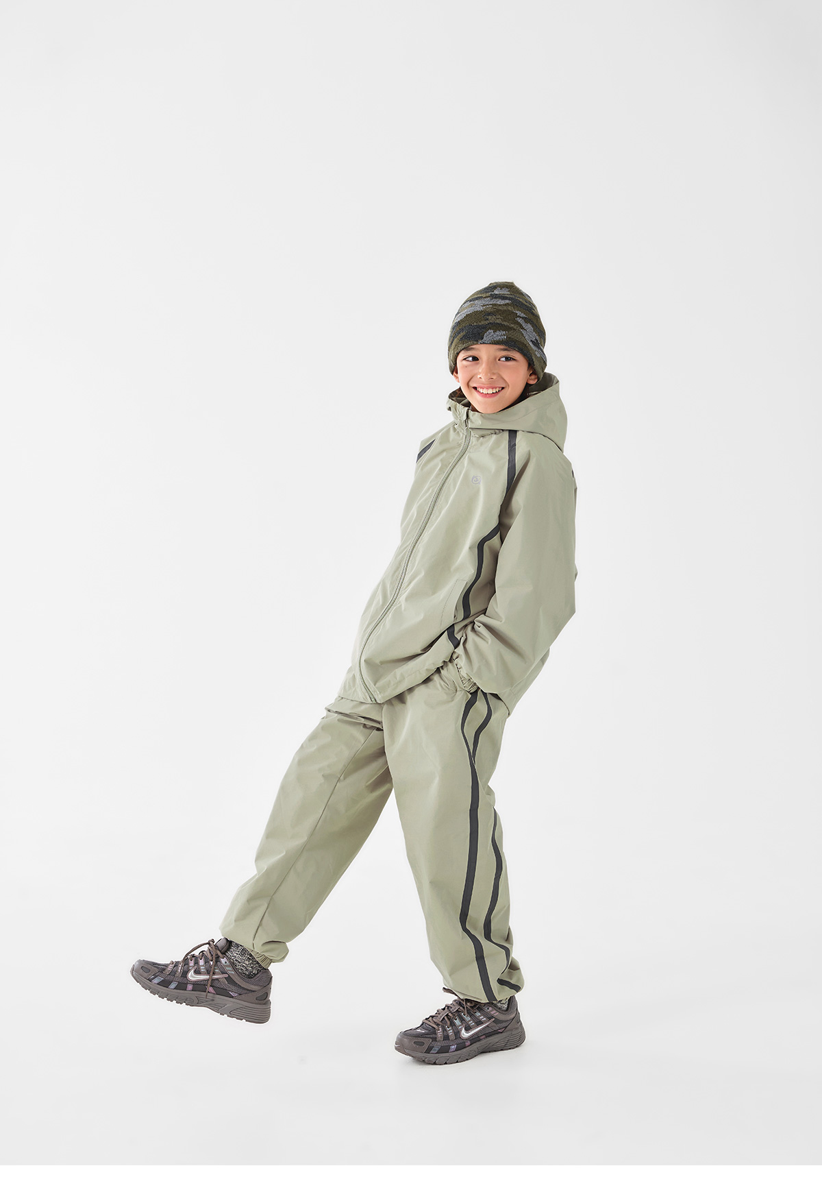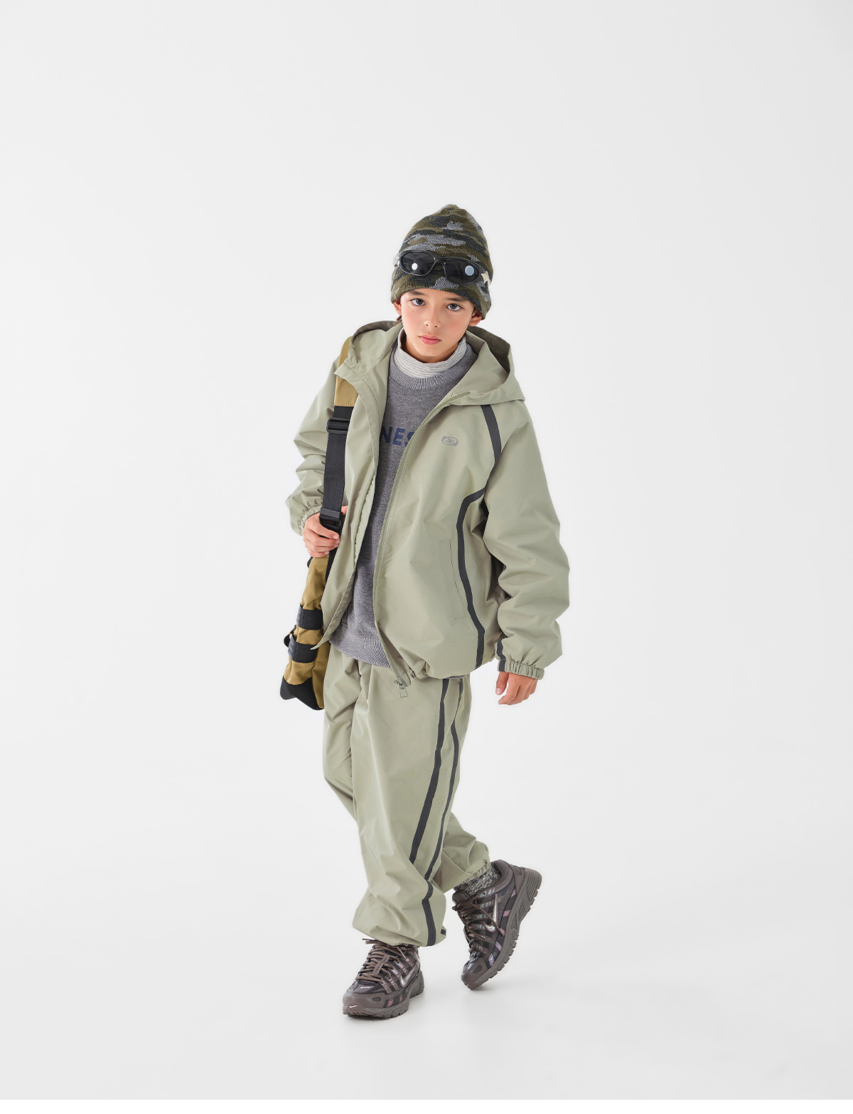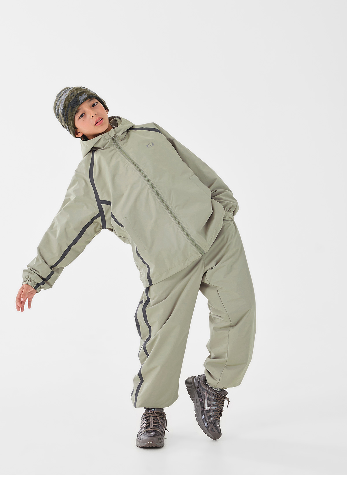 편안하면서도 스포티한 무드를 담은 연카키 컬러의 우븐 상하셋업이에요.