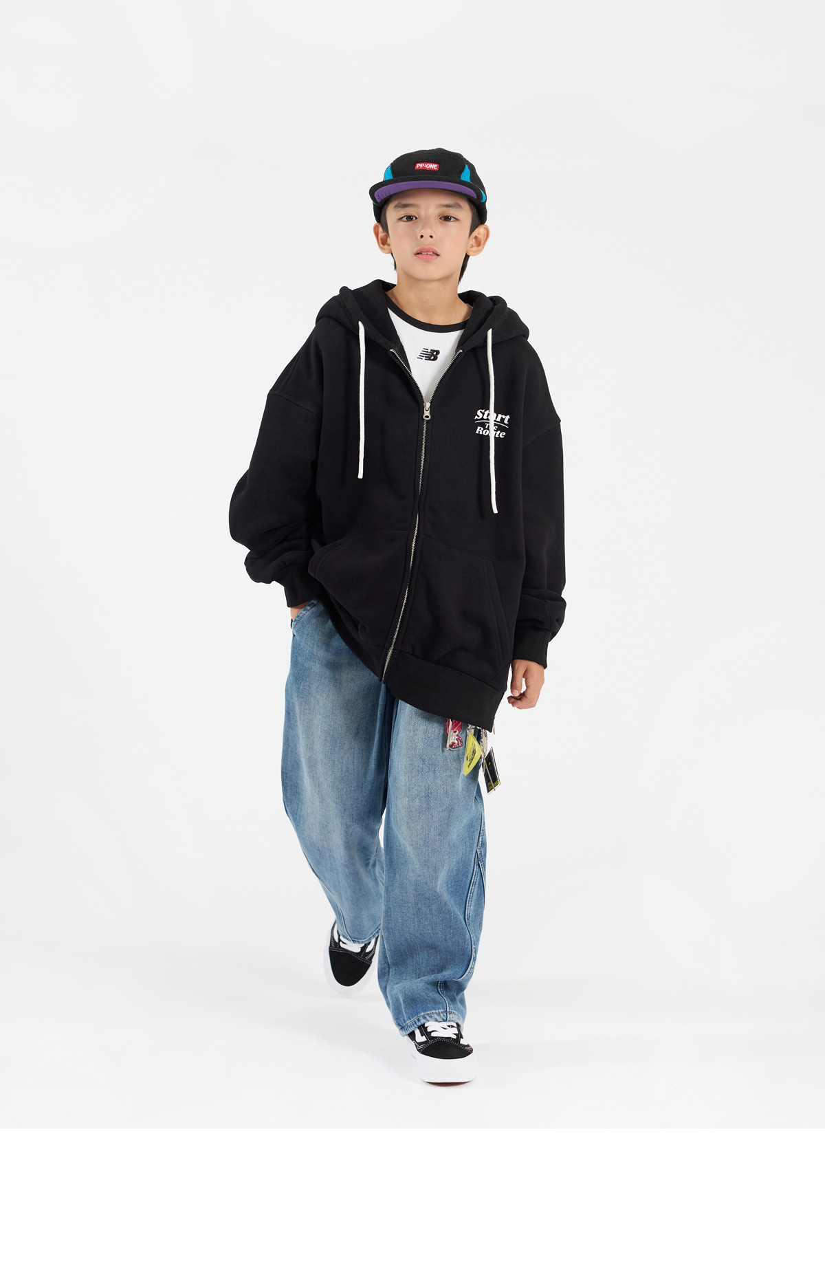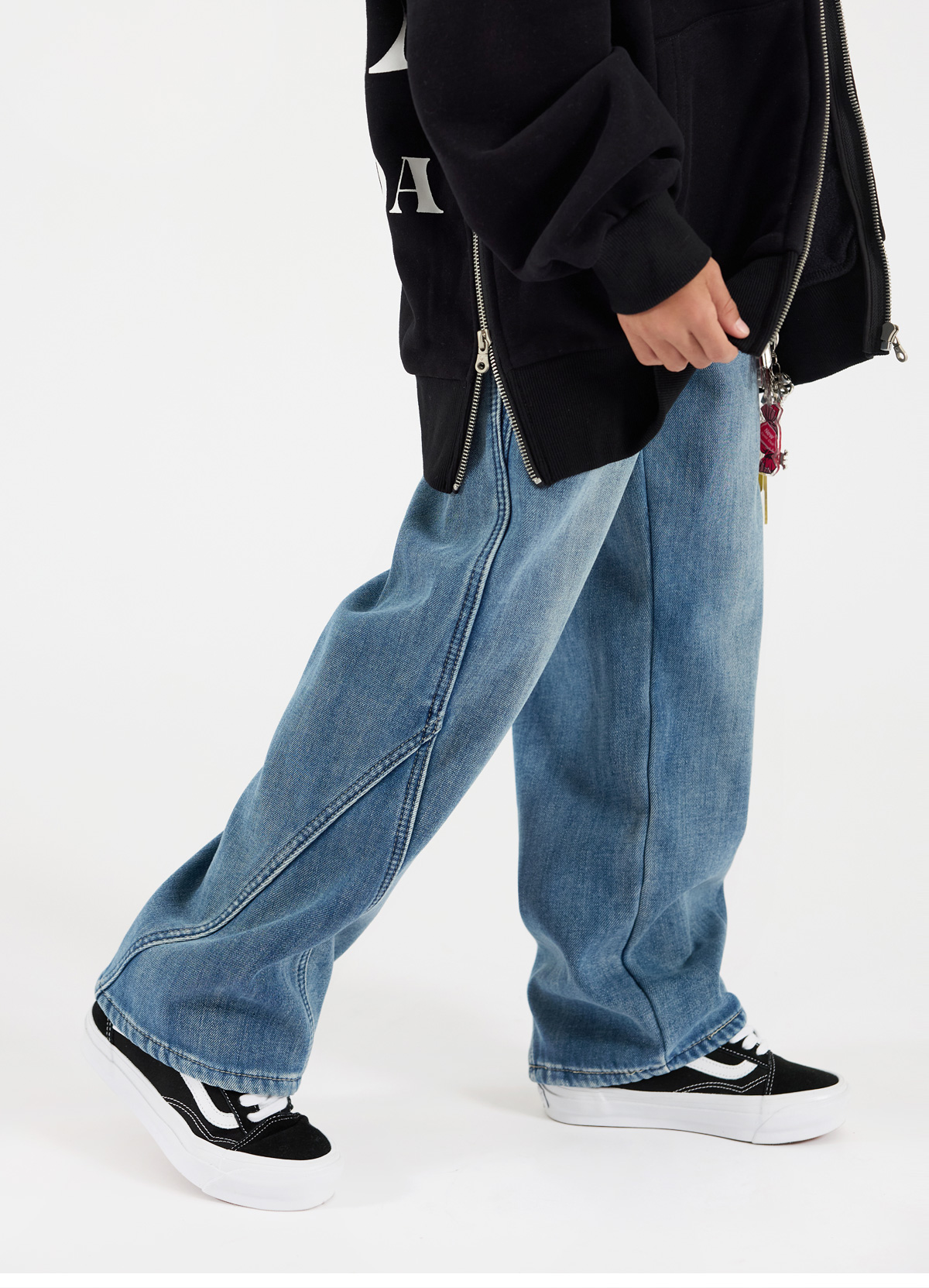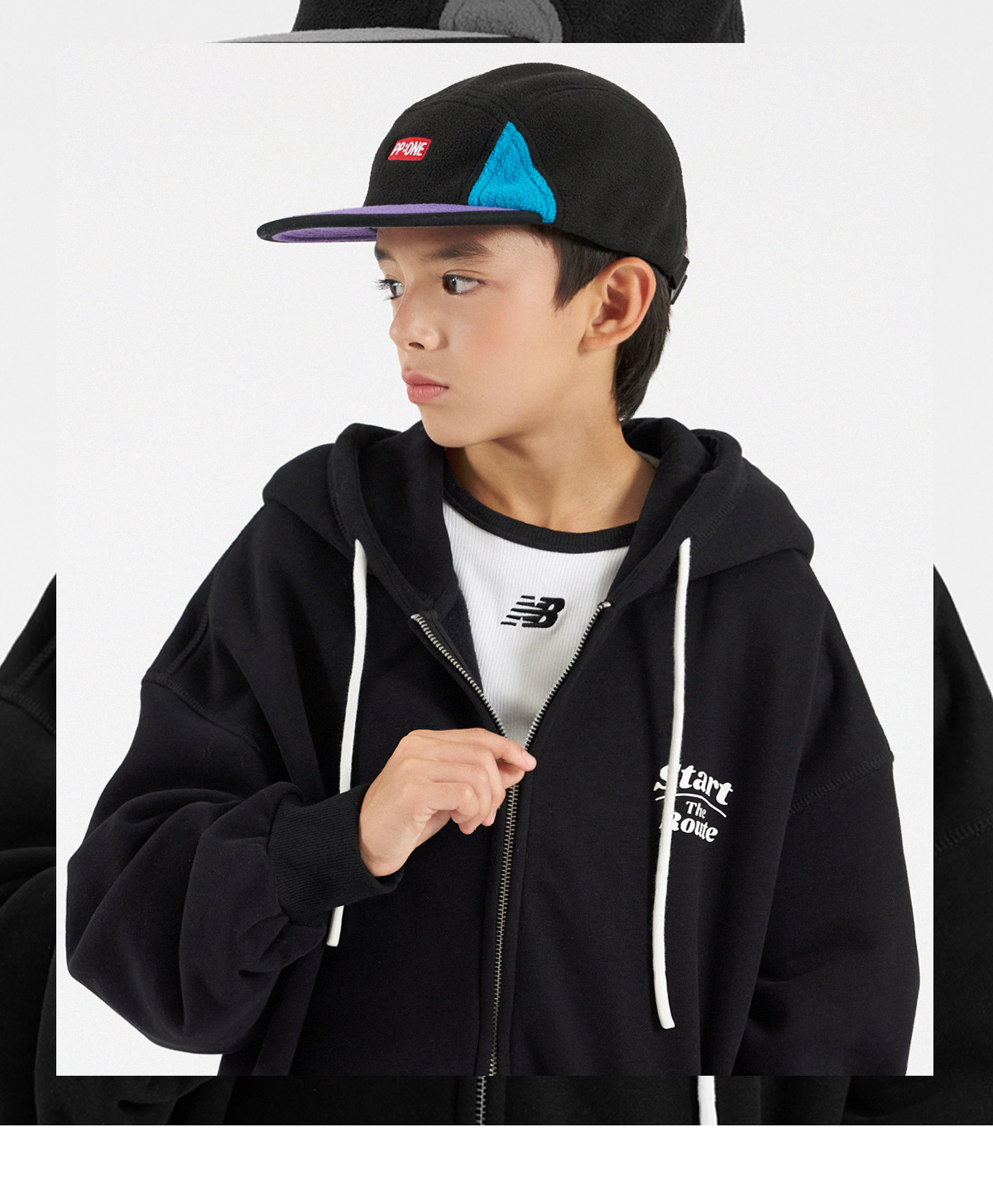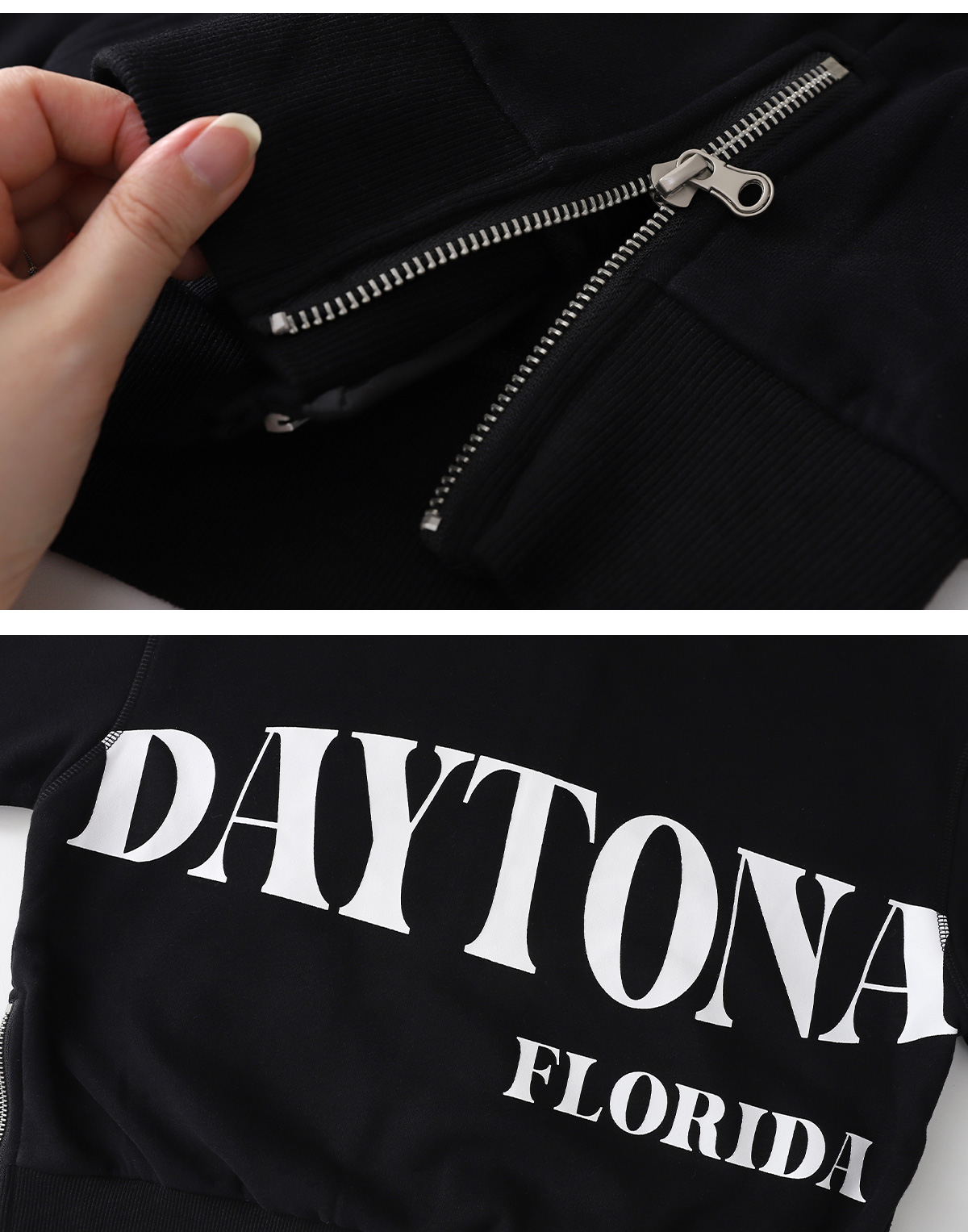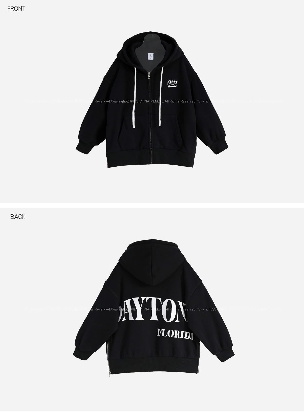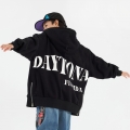 뒷면 큼직한 영문 나염과 사이트 지퍼 디테일이 돋보이는 기모 후드 집업