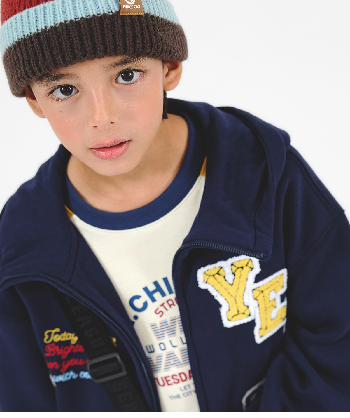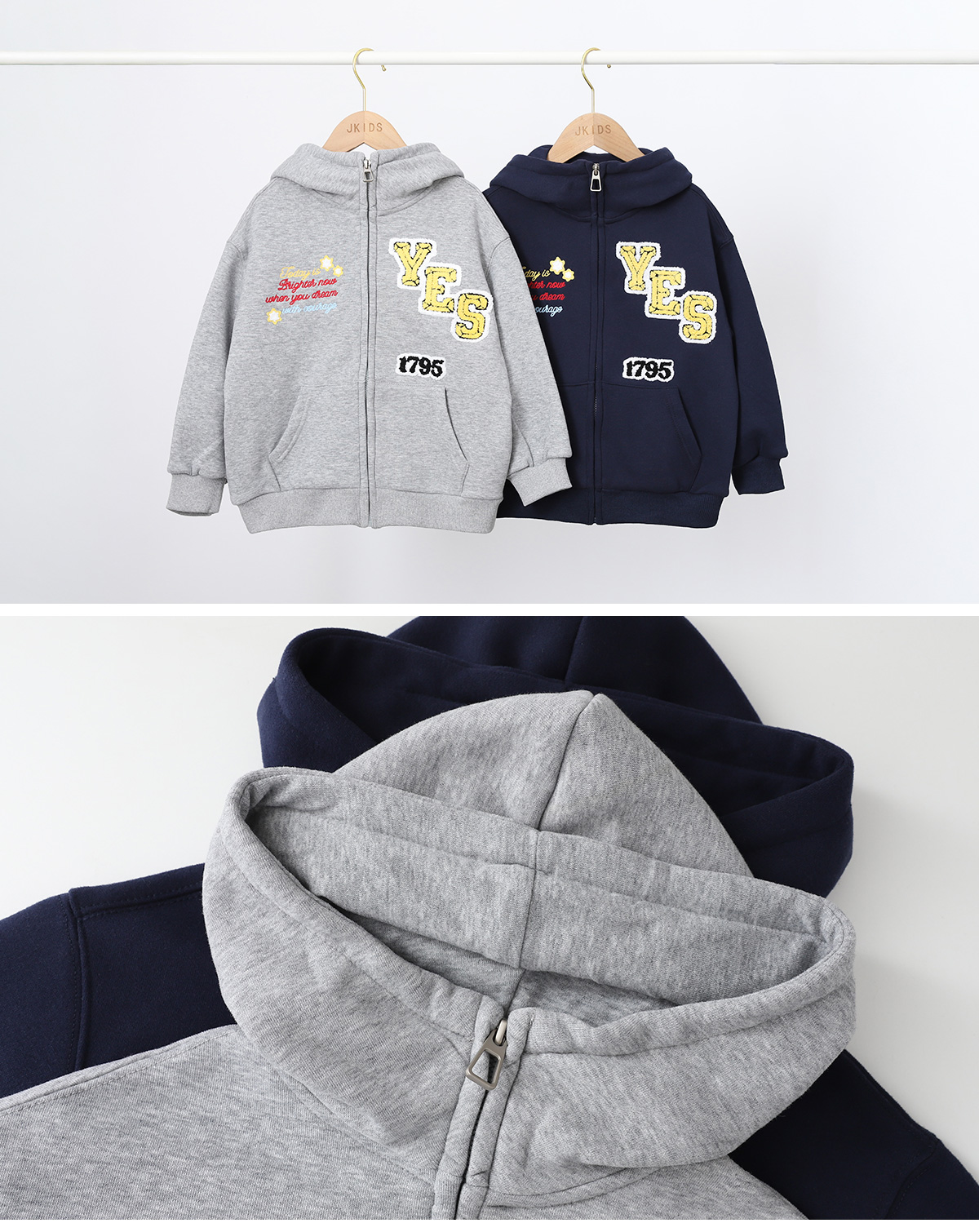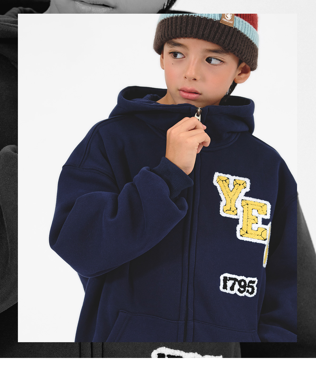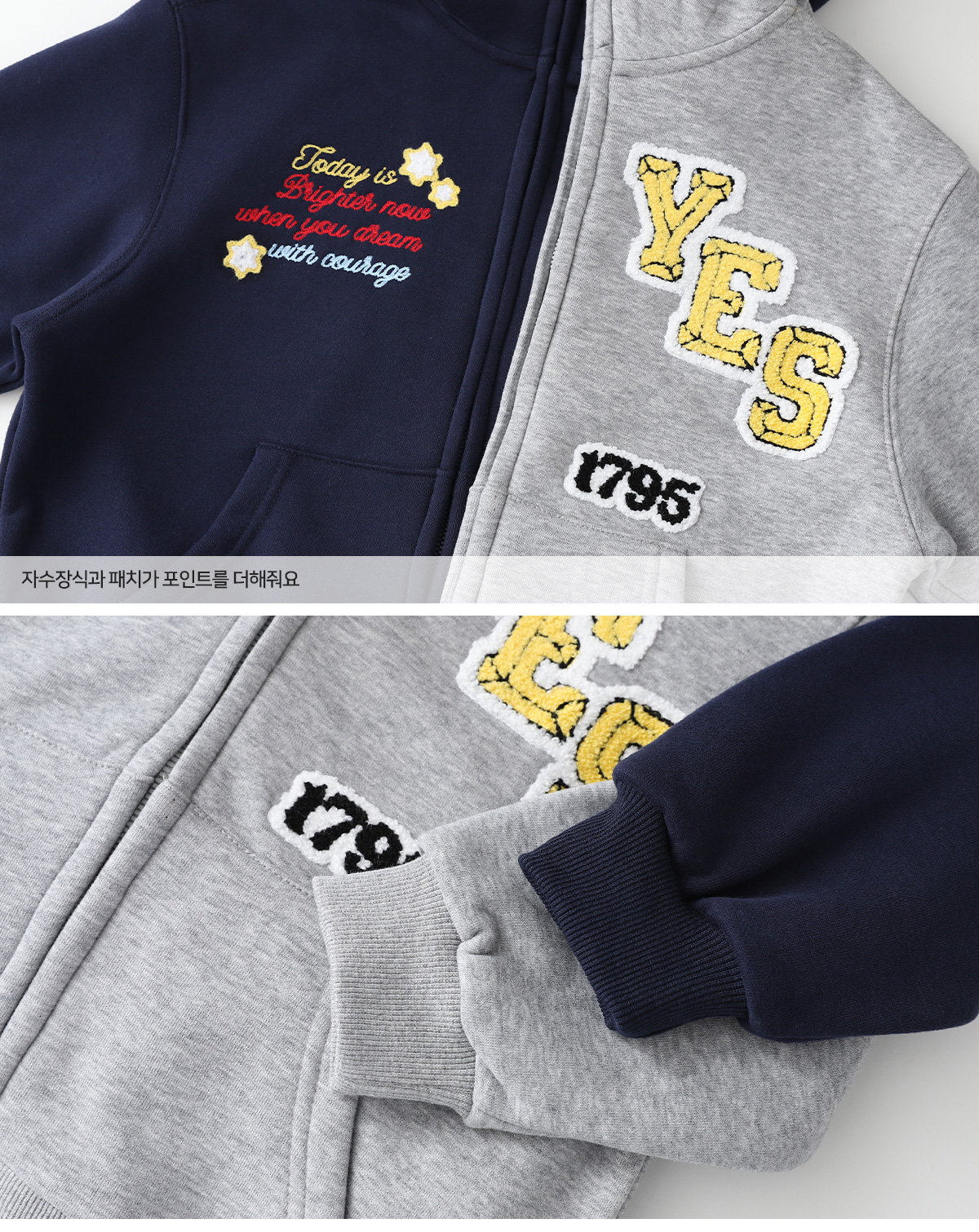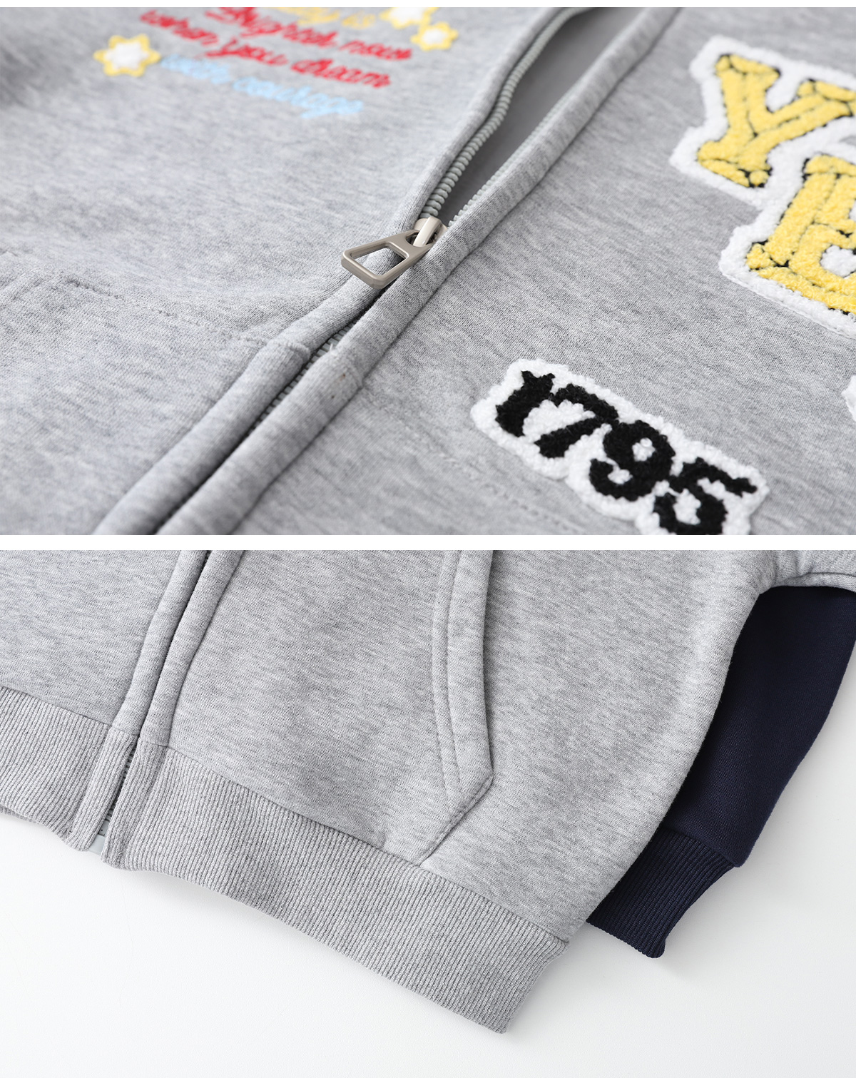 프론트 자수 디테일이 돋보이는 기모 후드 집업이에요.
