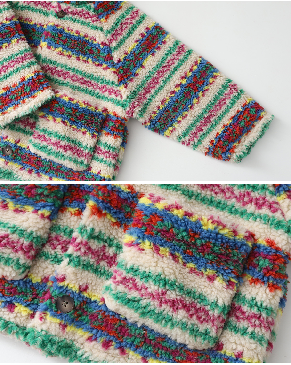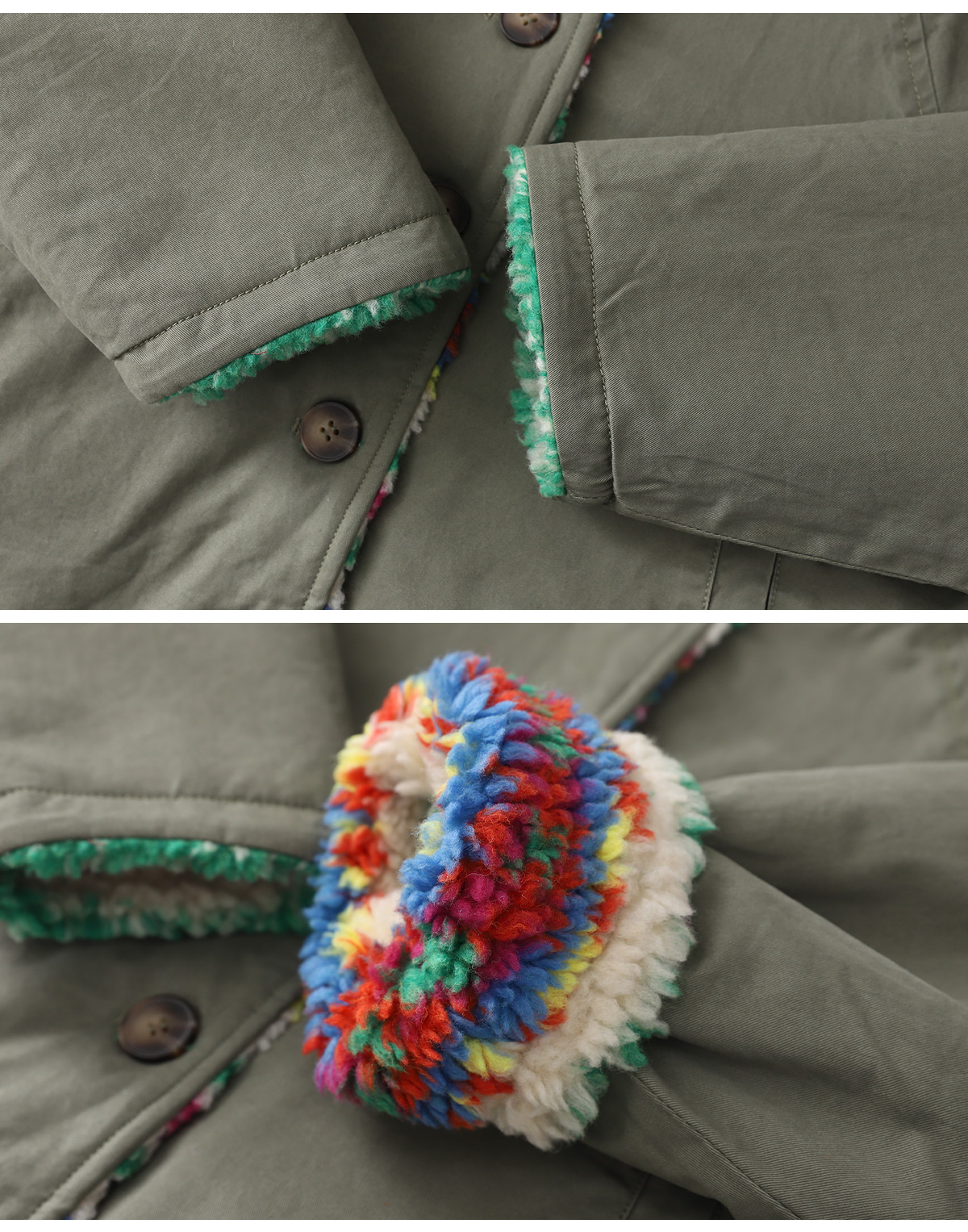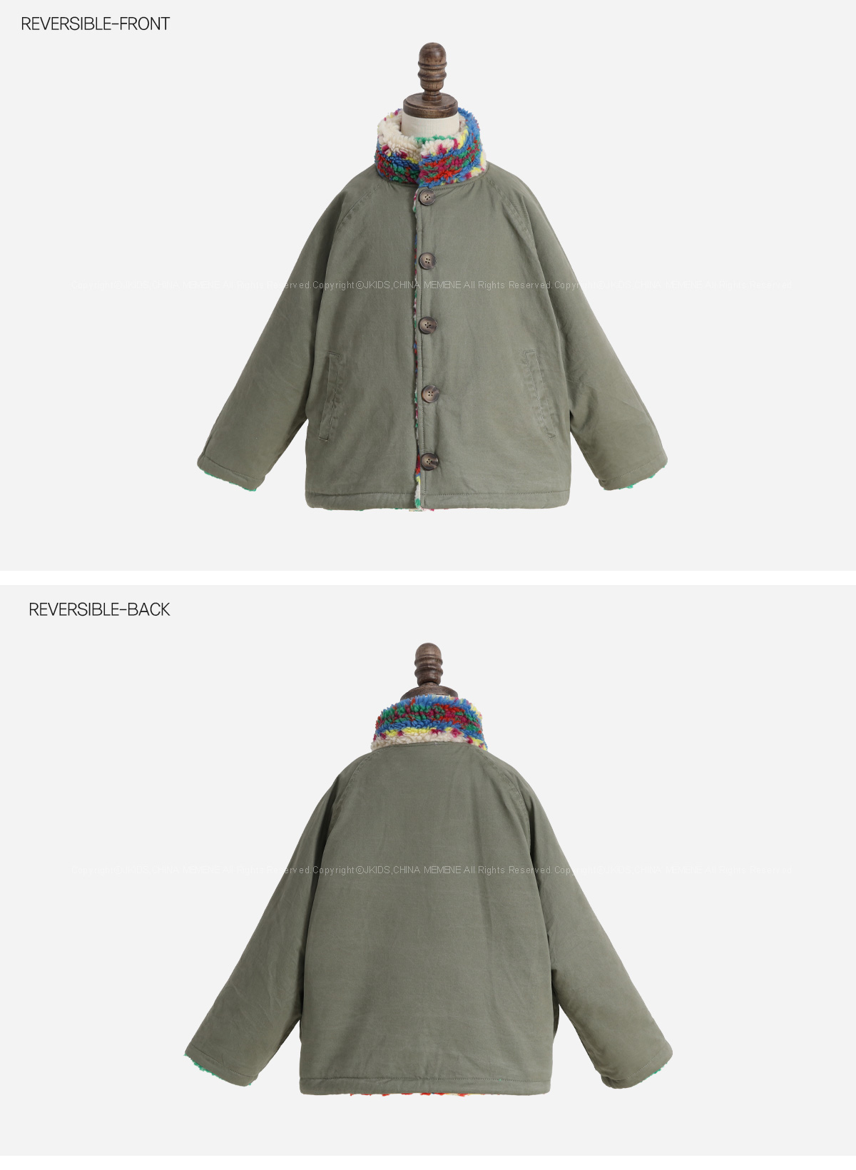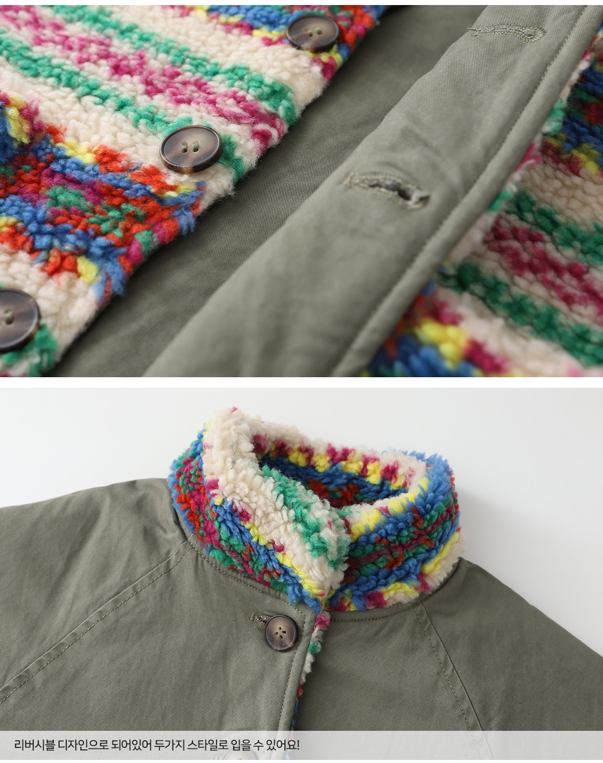 톡톡 튀는 색감이 매력적인 리버시블 뽀글이 아우터예요.
