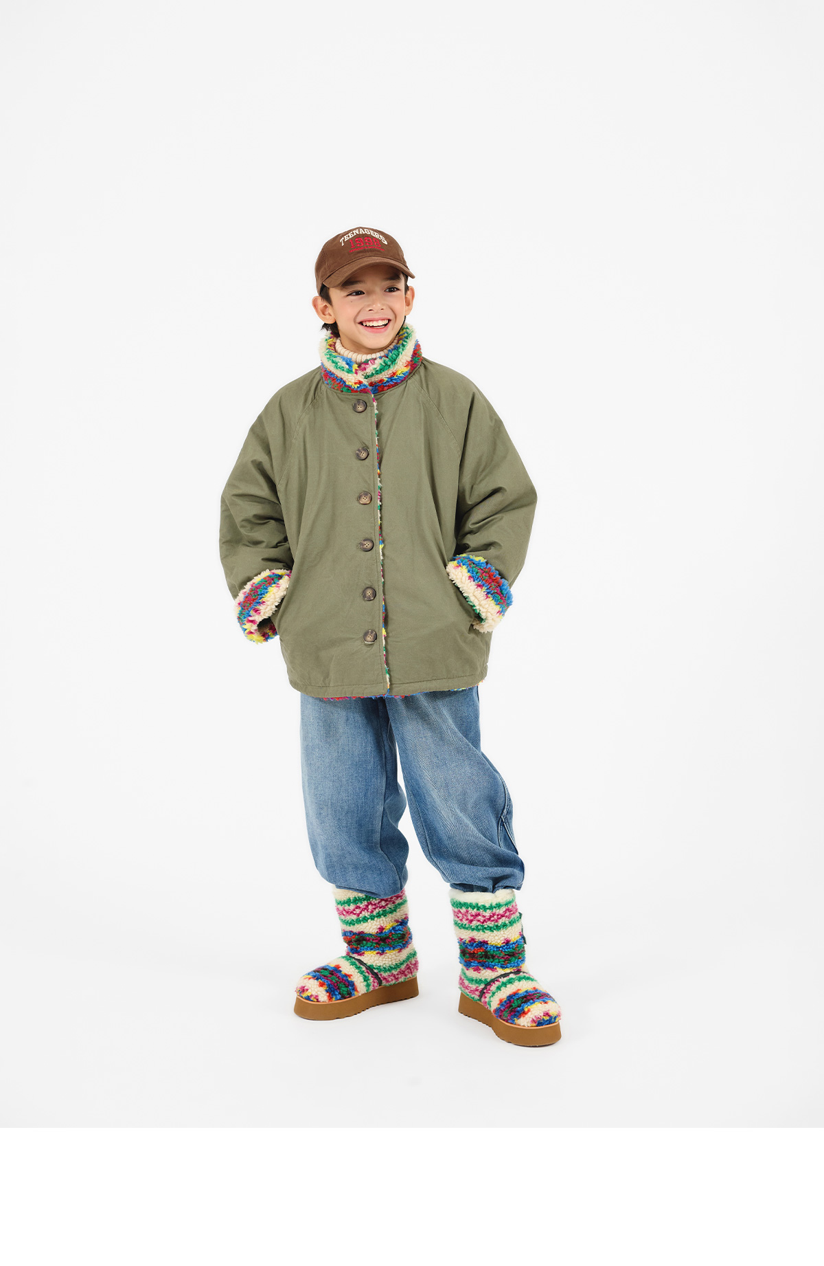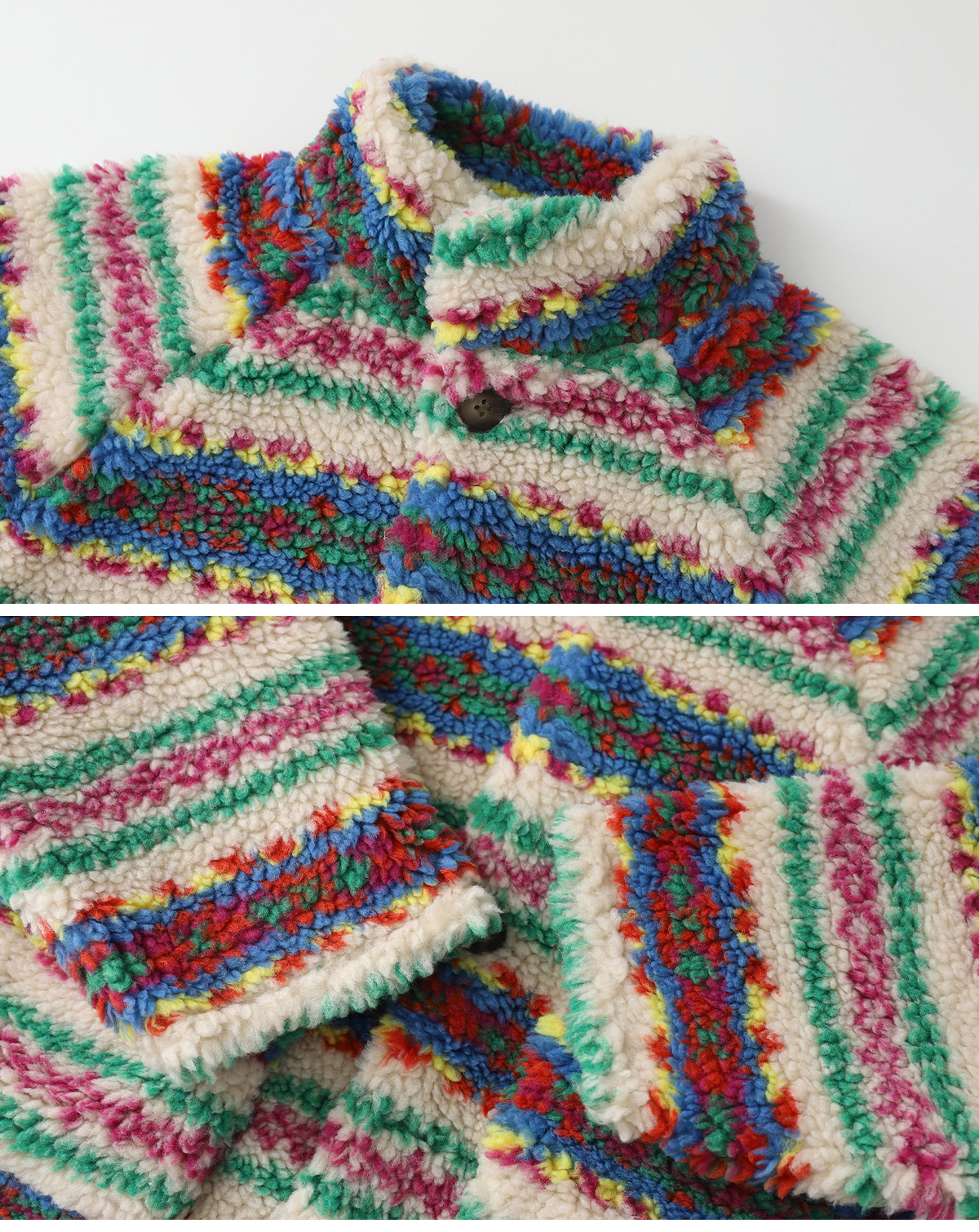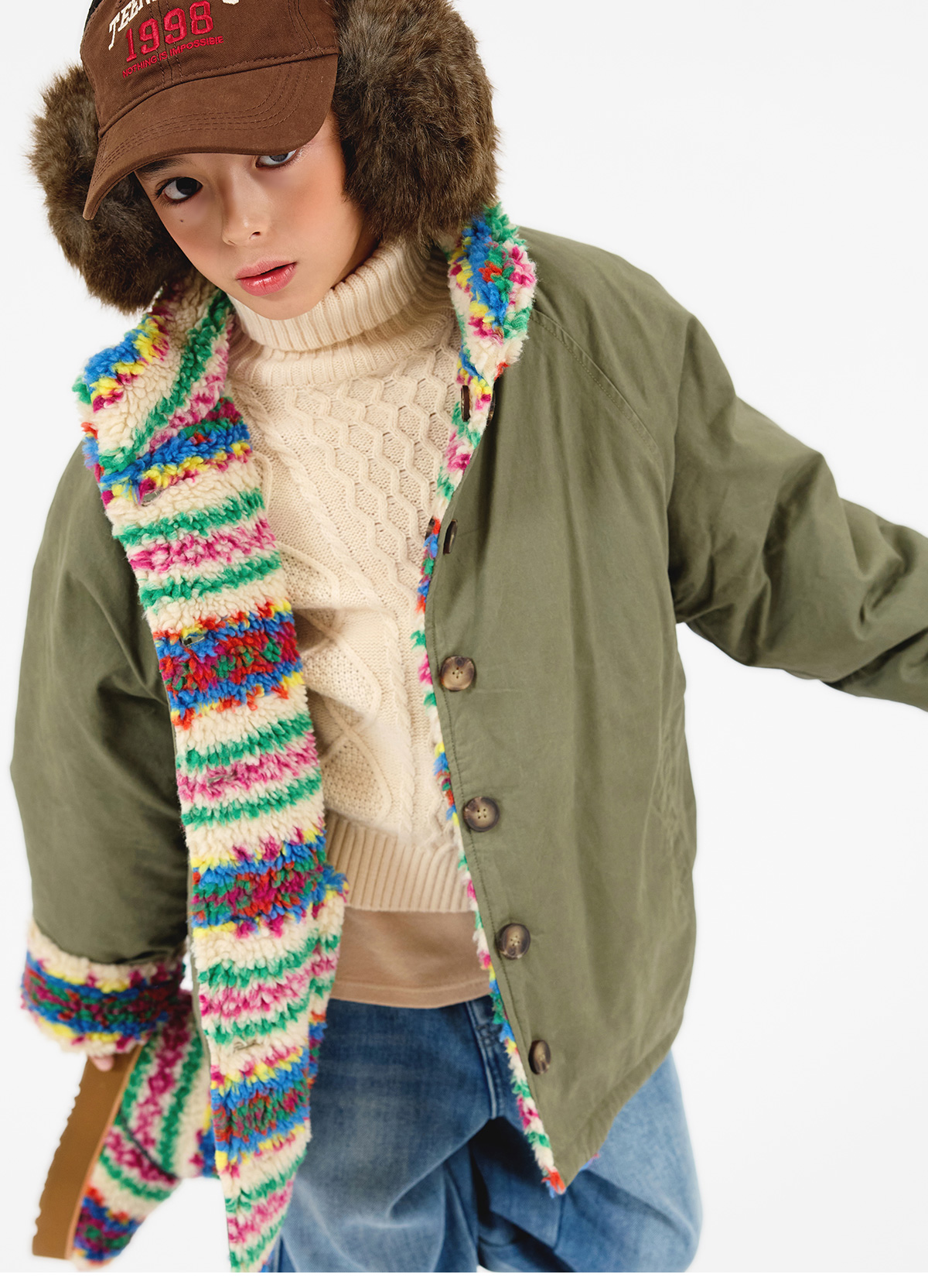 톡톡 튀는 색감이 매력적인 리버시블 뽀글이 아우터예요.