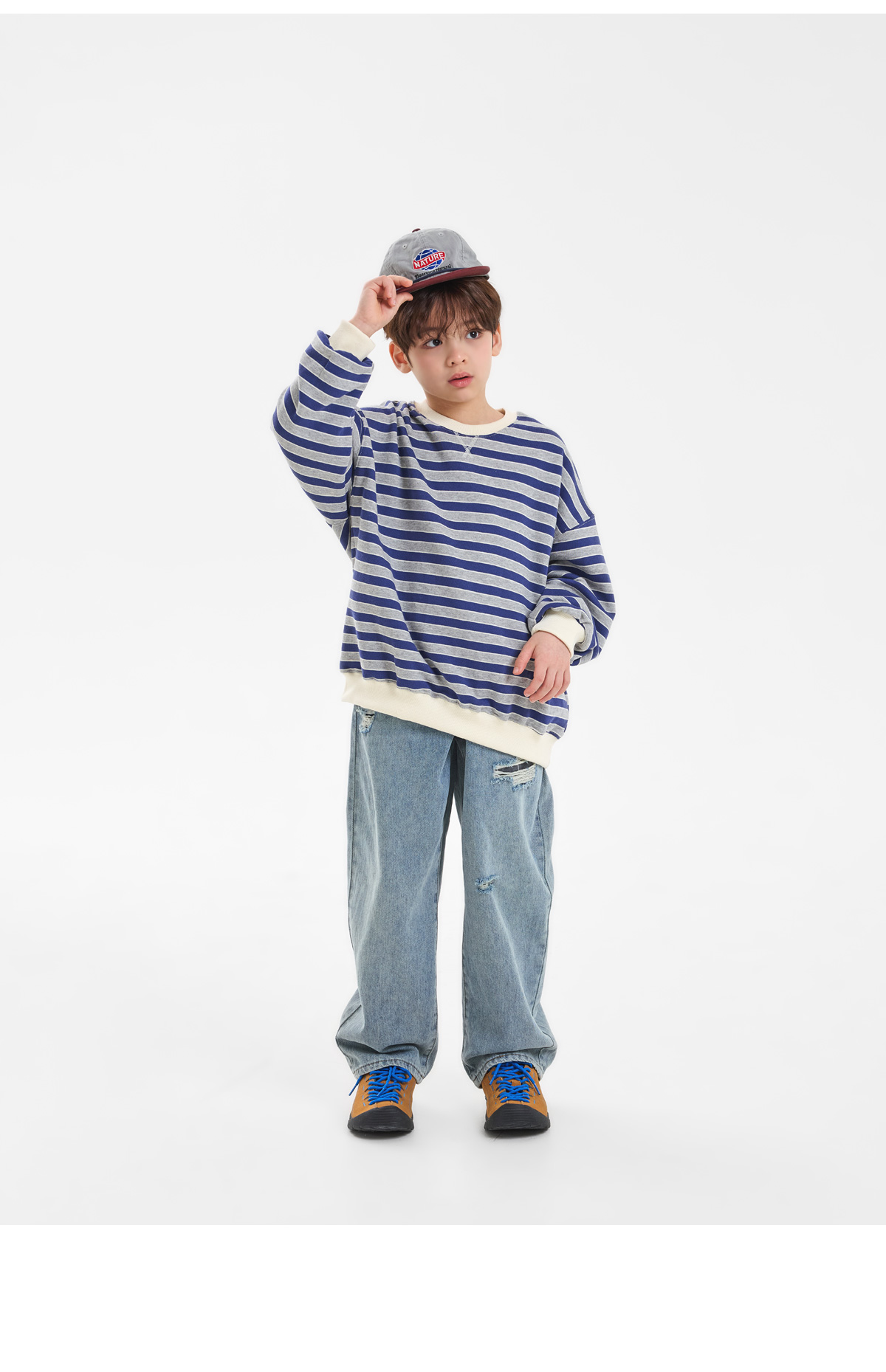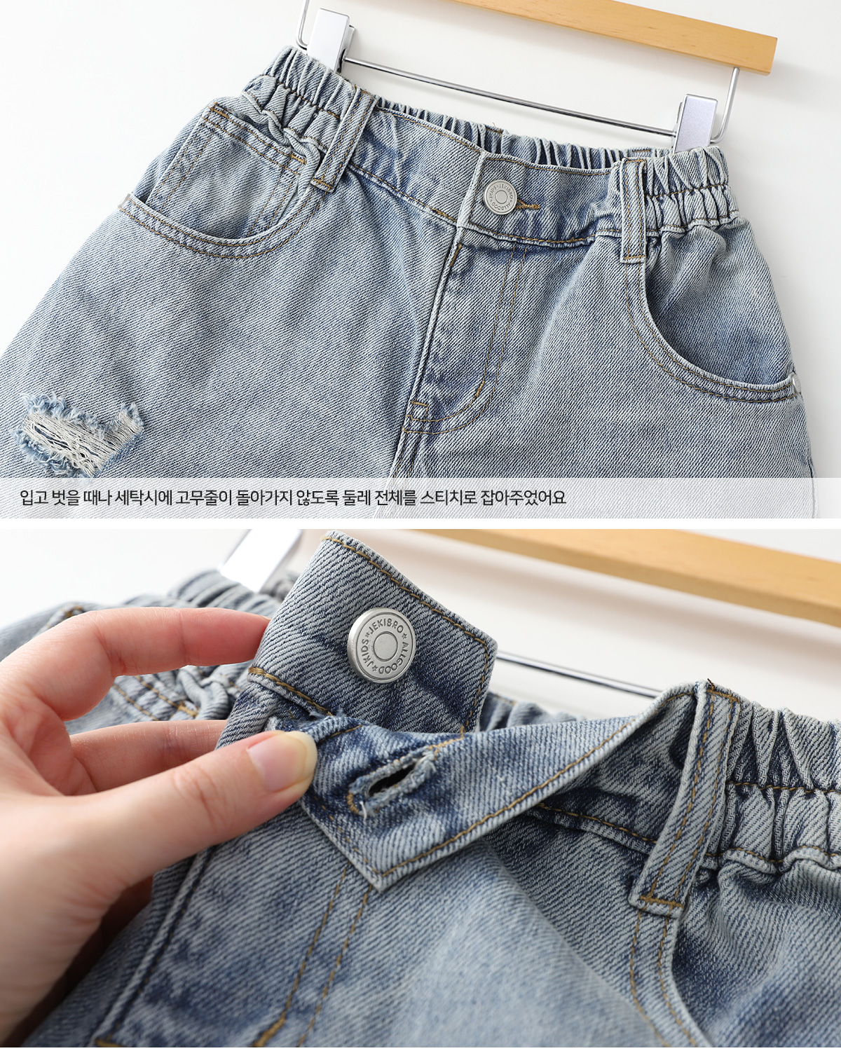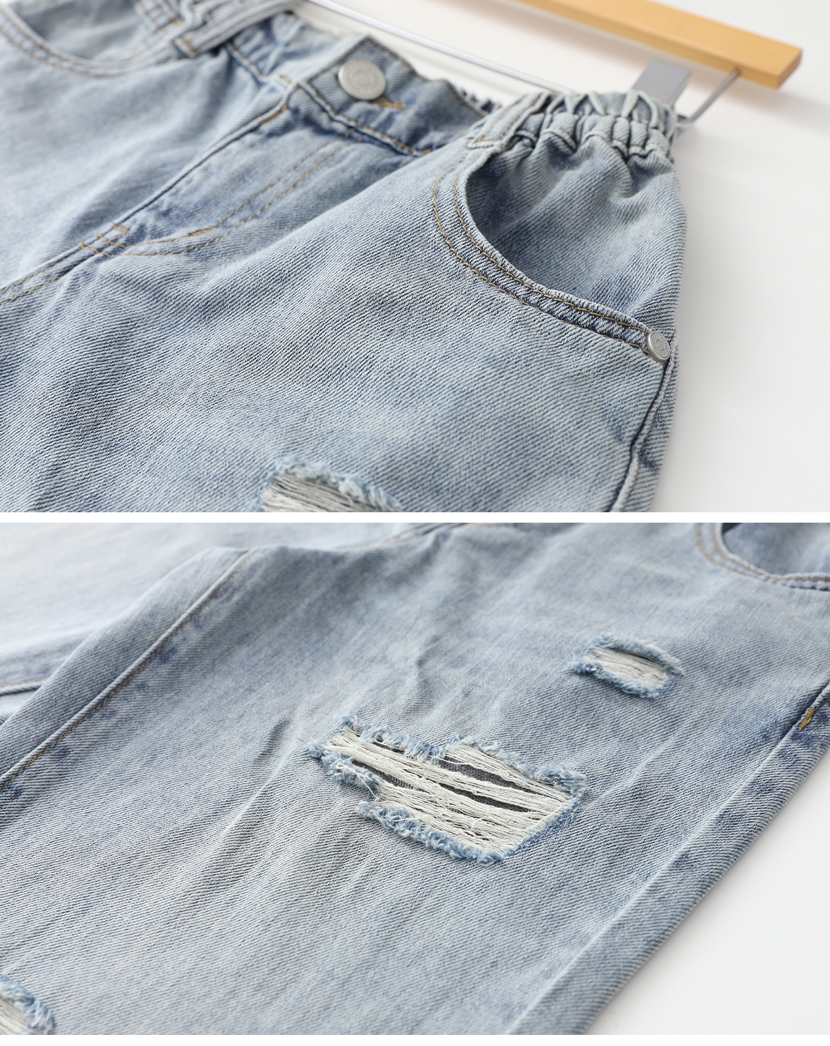 데미지 디테일이 자연스럽게 더해진 중청 컬러 데님팬츠예요.
