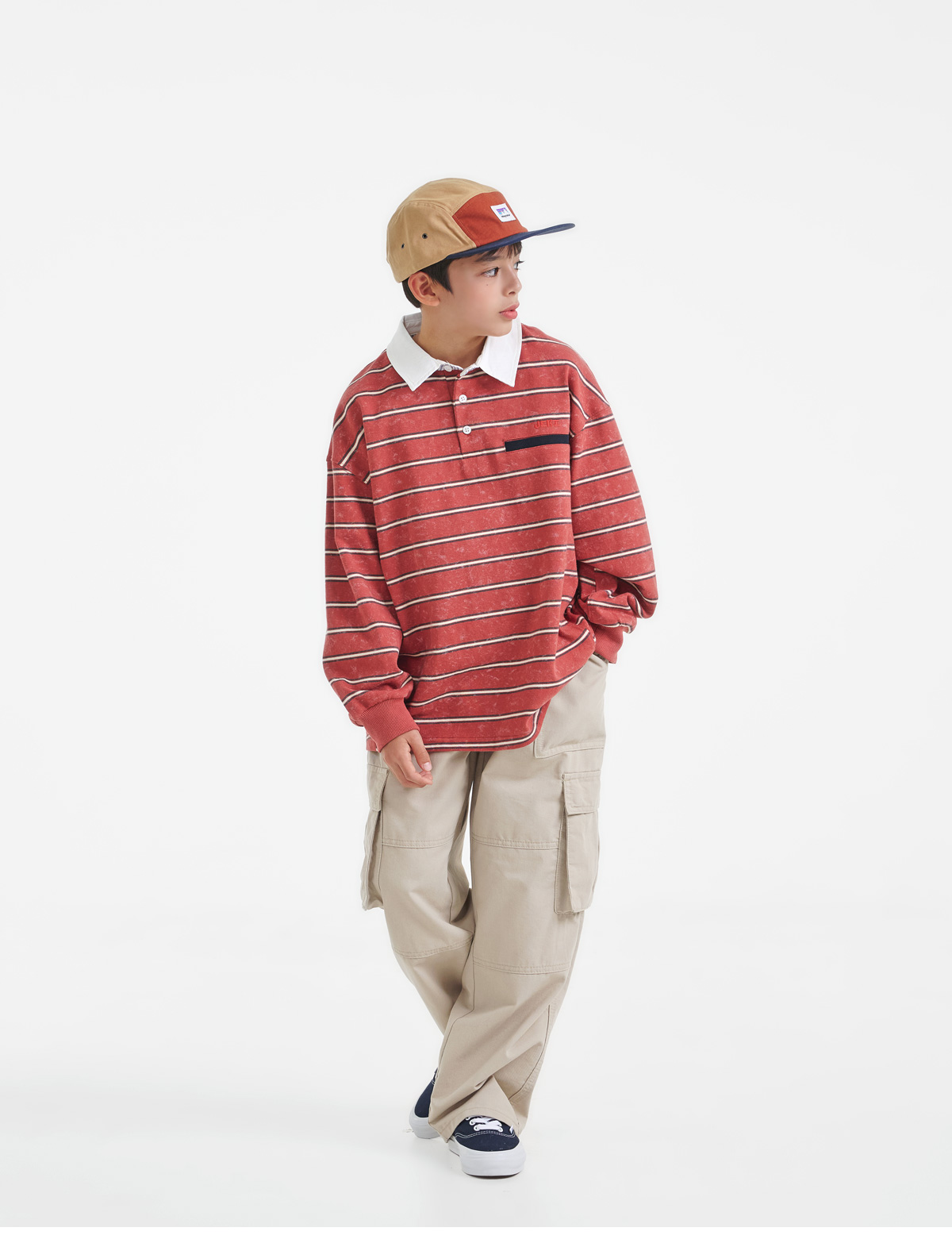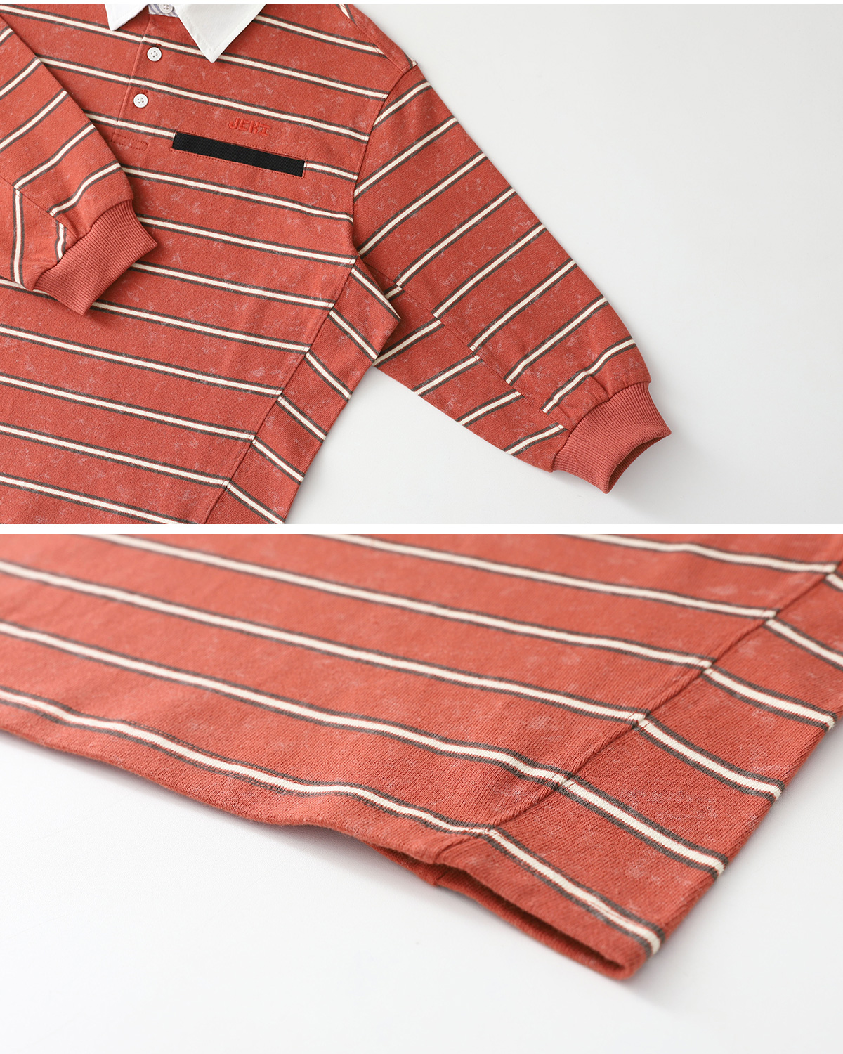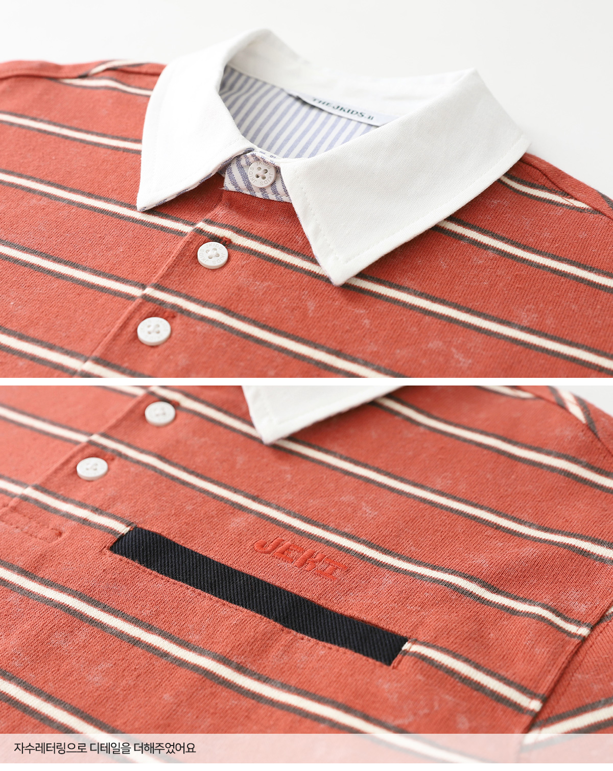잔잔한 스트라이프 패턴이 눈에 들어오는 카라 티셔츠예요.
