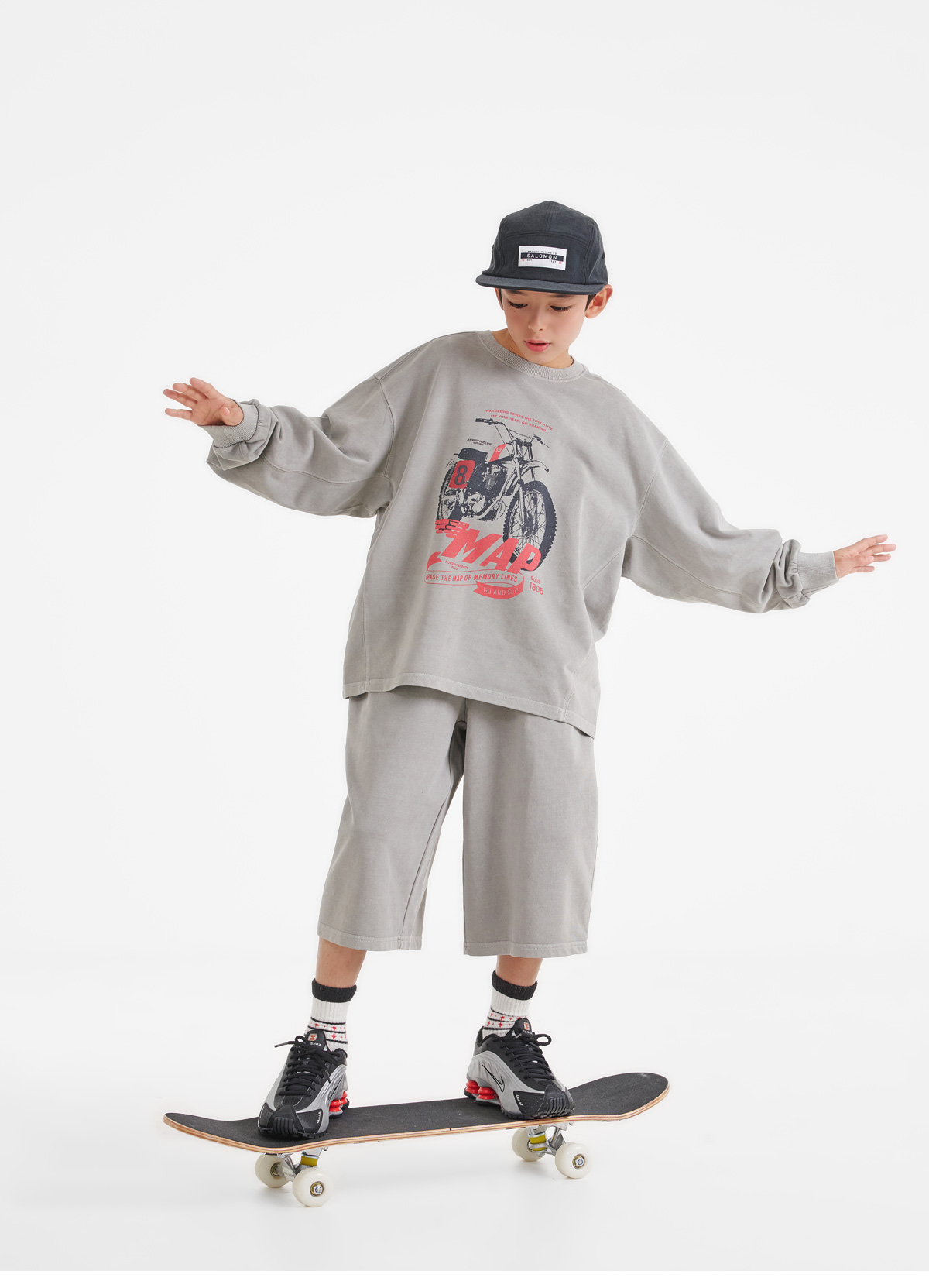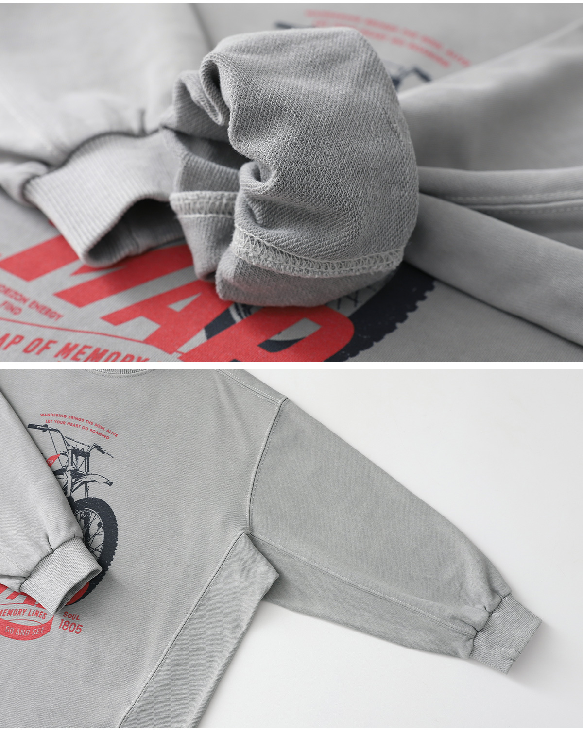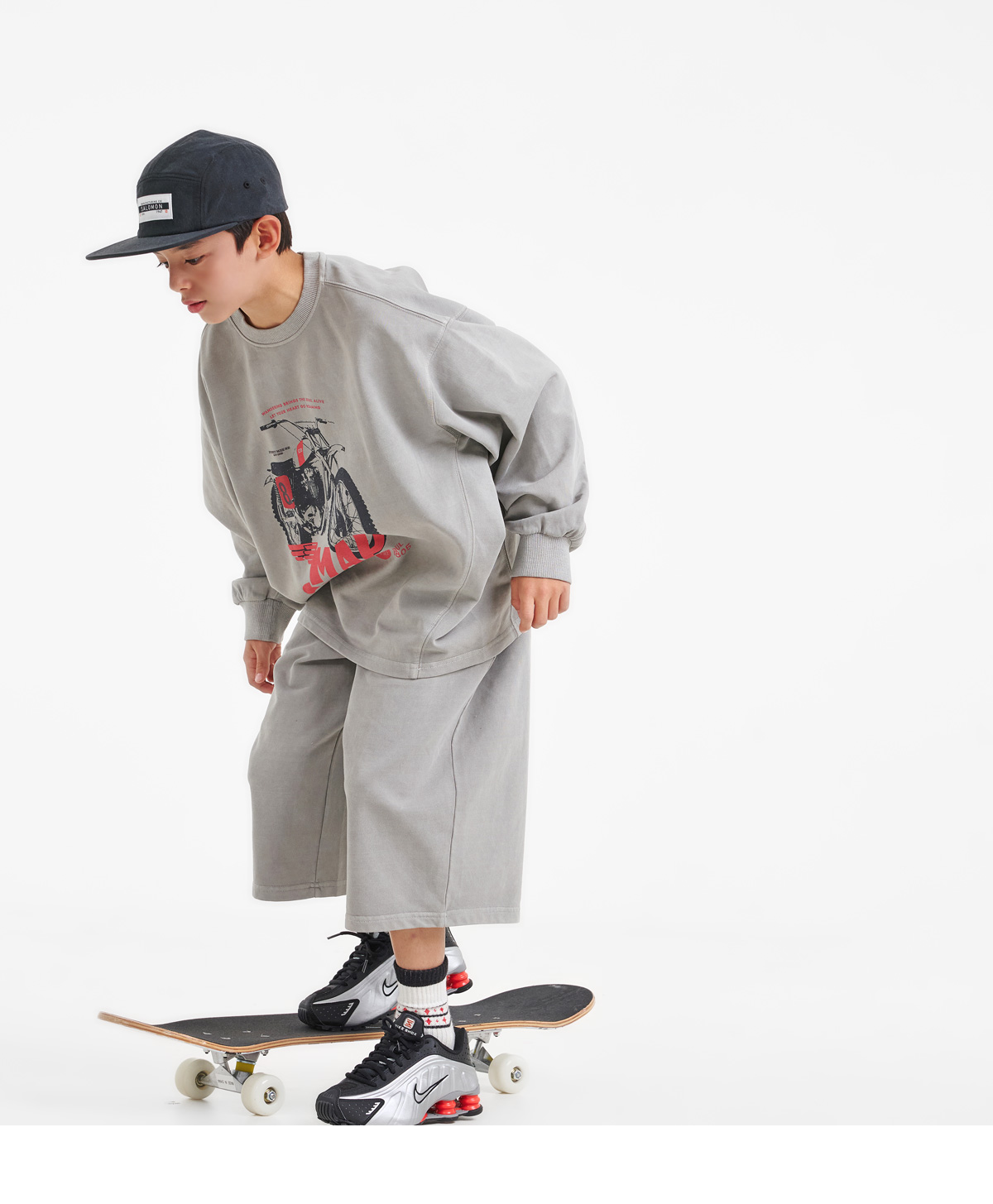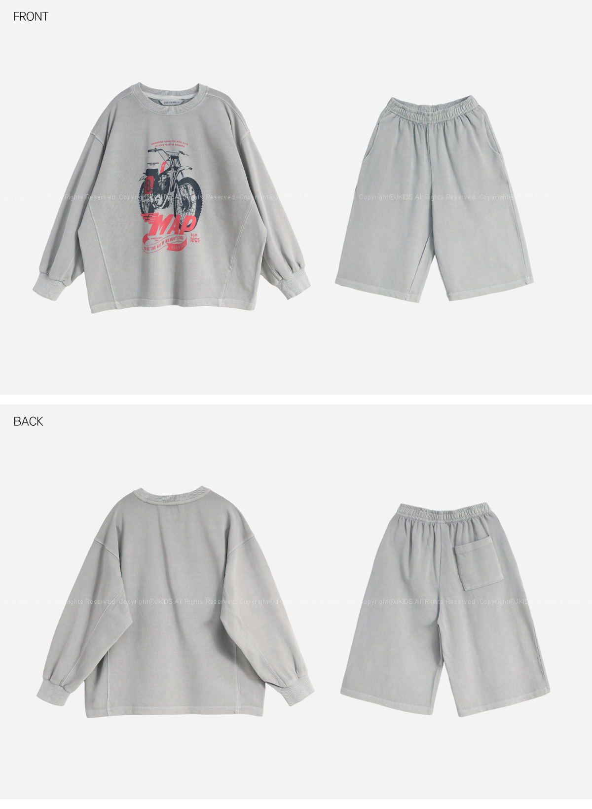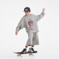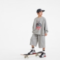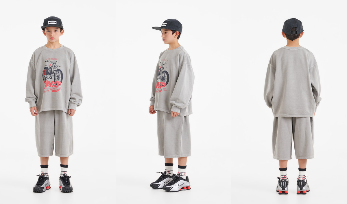 프린팅 맨투맨과 버뮤다 팬츠로 구성된 상하 세트예요.