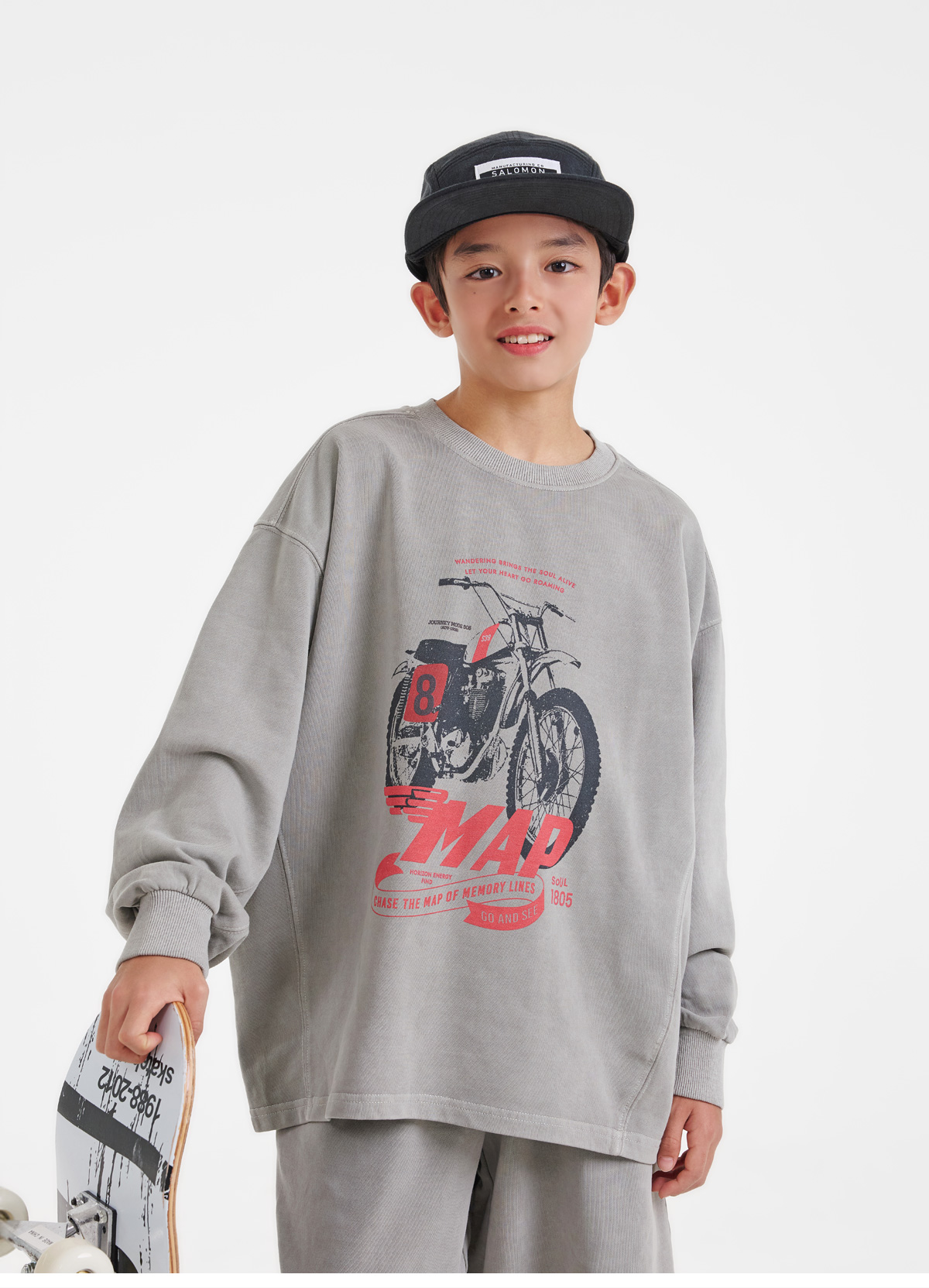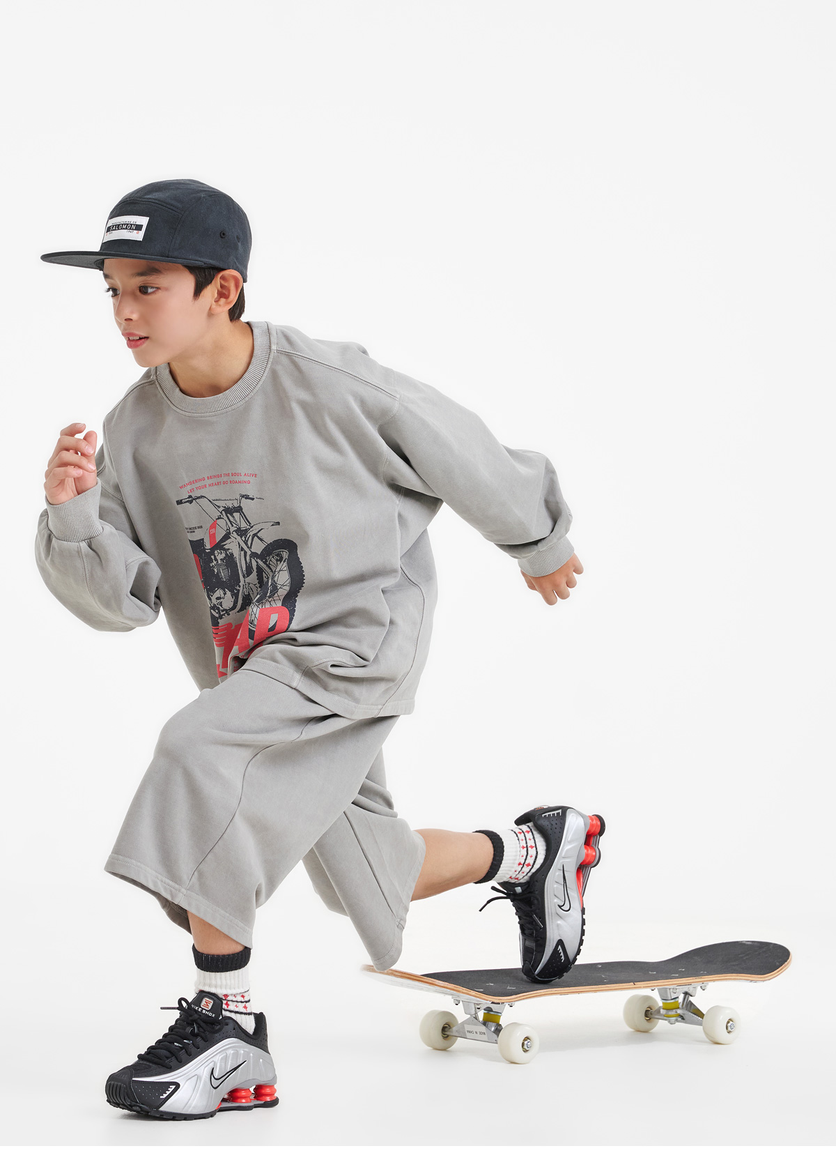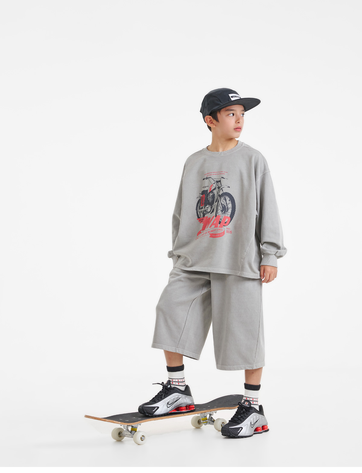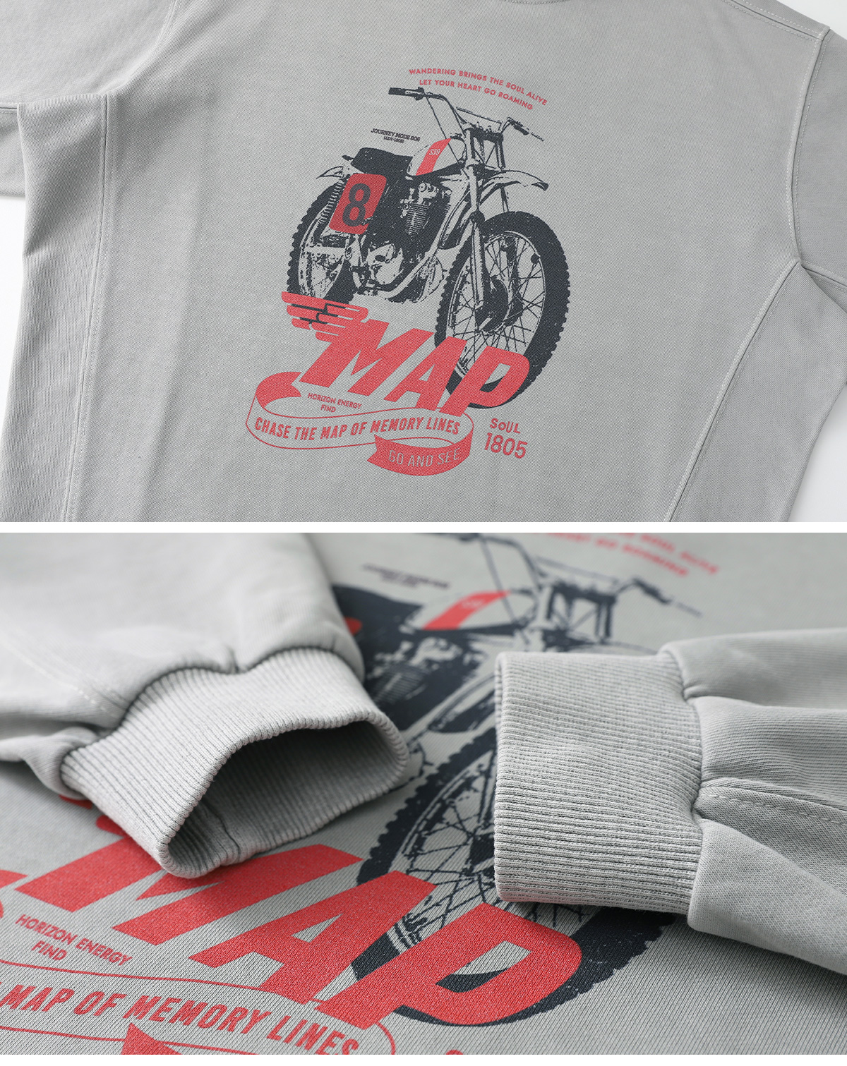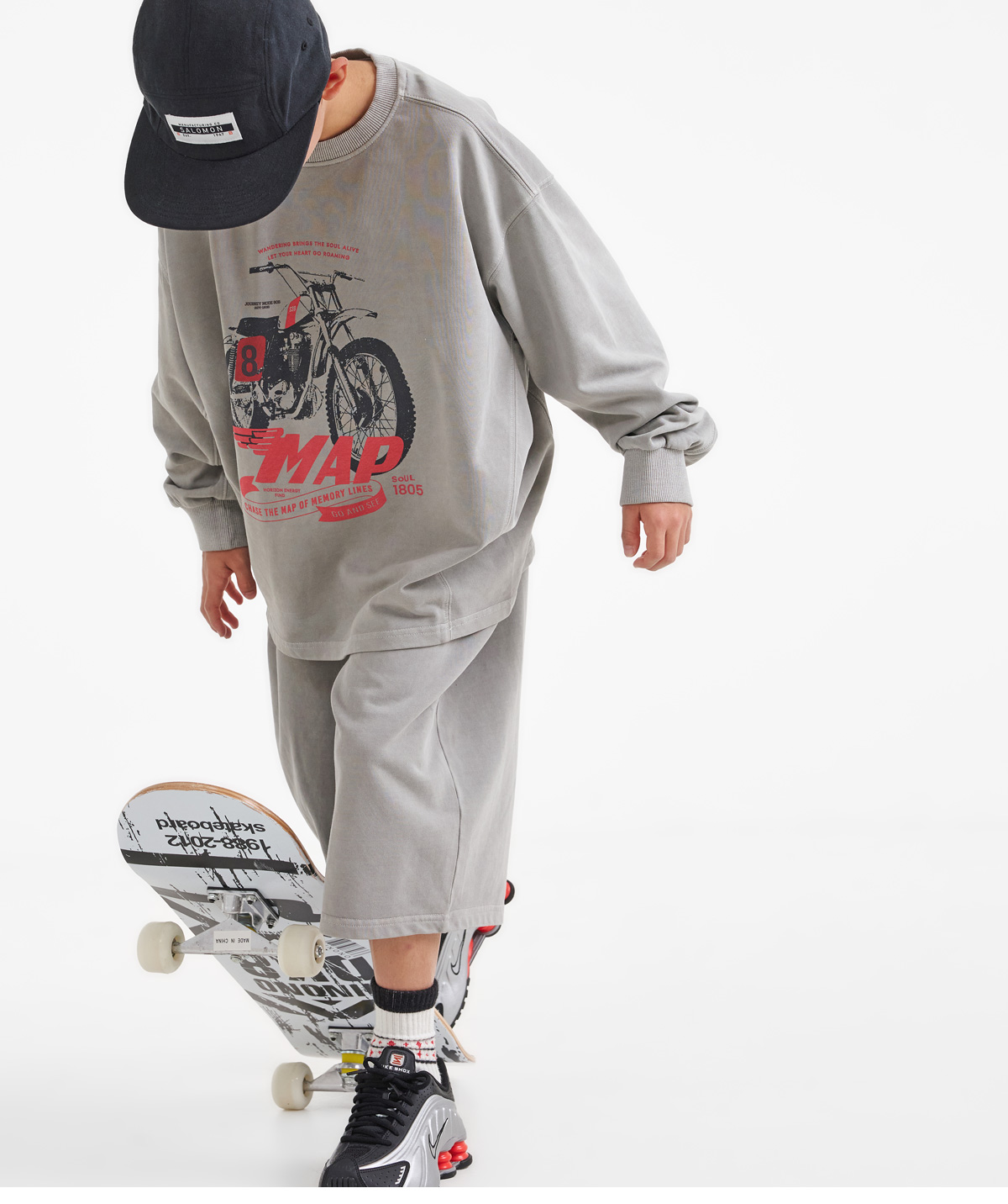 프린팅 맨투맨과 버뮤다 팬츠로 구성된 상하 세트예요.