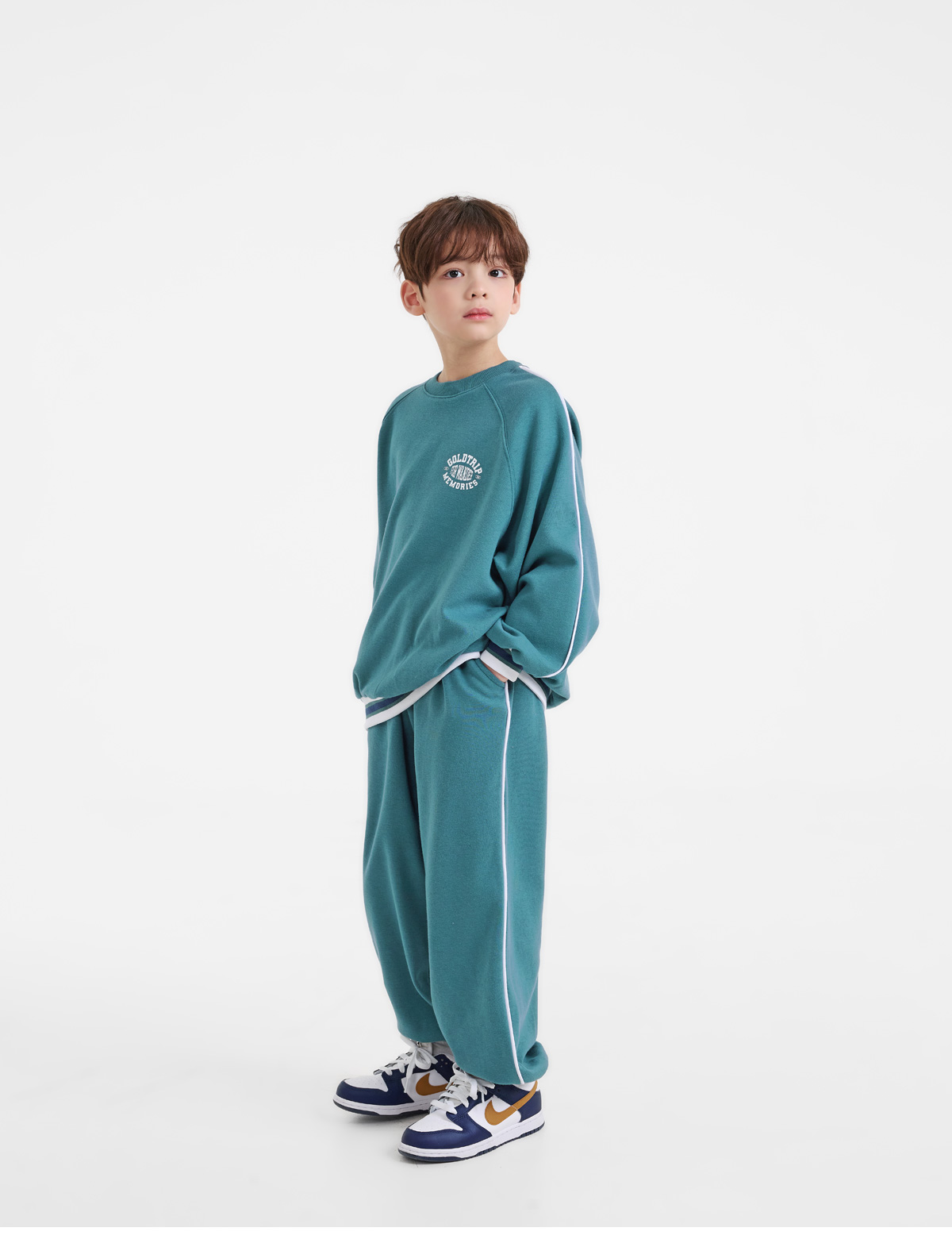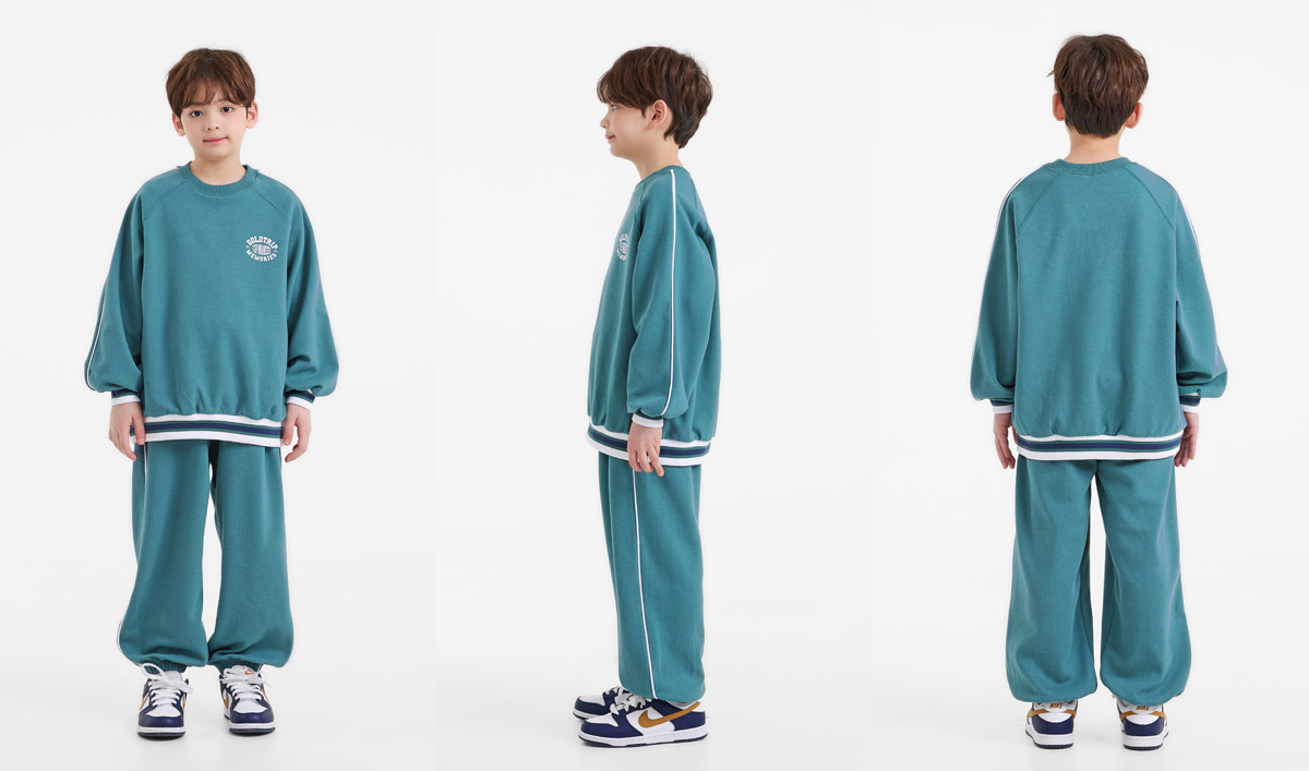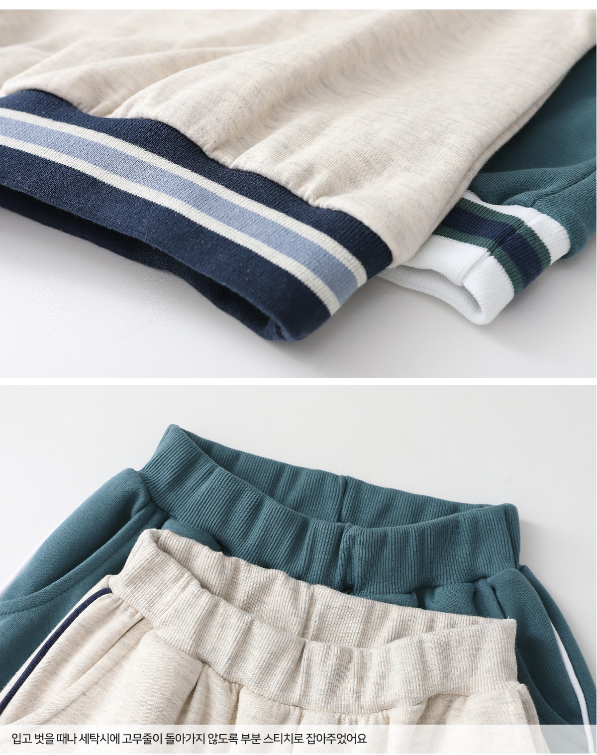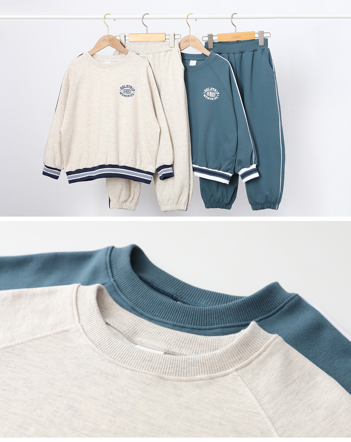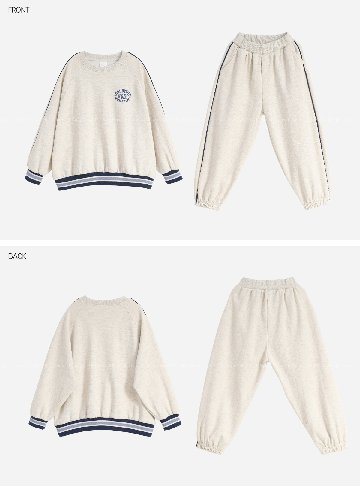 담백한 분위기의 맨투맨과 팬츠가 한 세트로 구성된 상하세트예요.