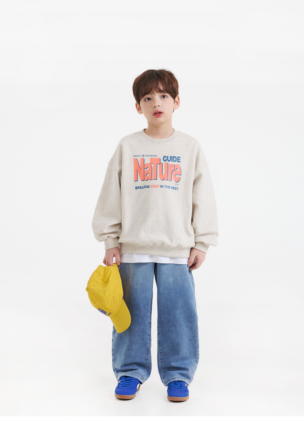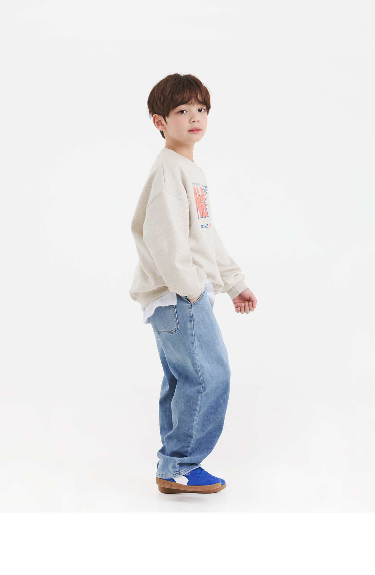 전면 산뜻한 컬러감의 영문 나염이 돋보이는 맨투맨