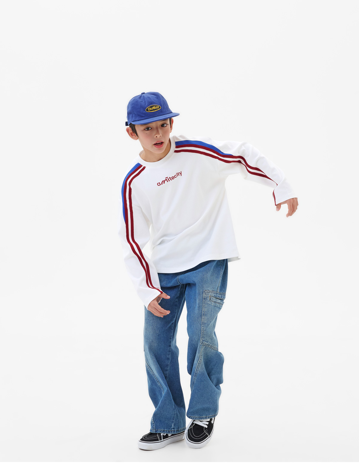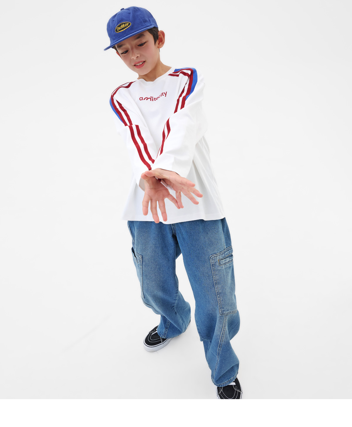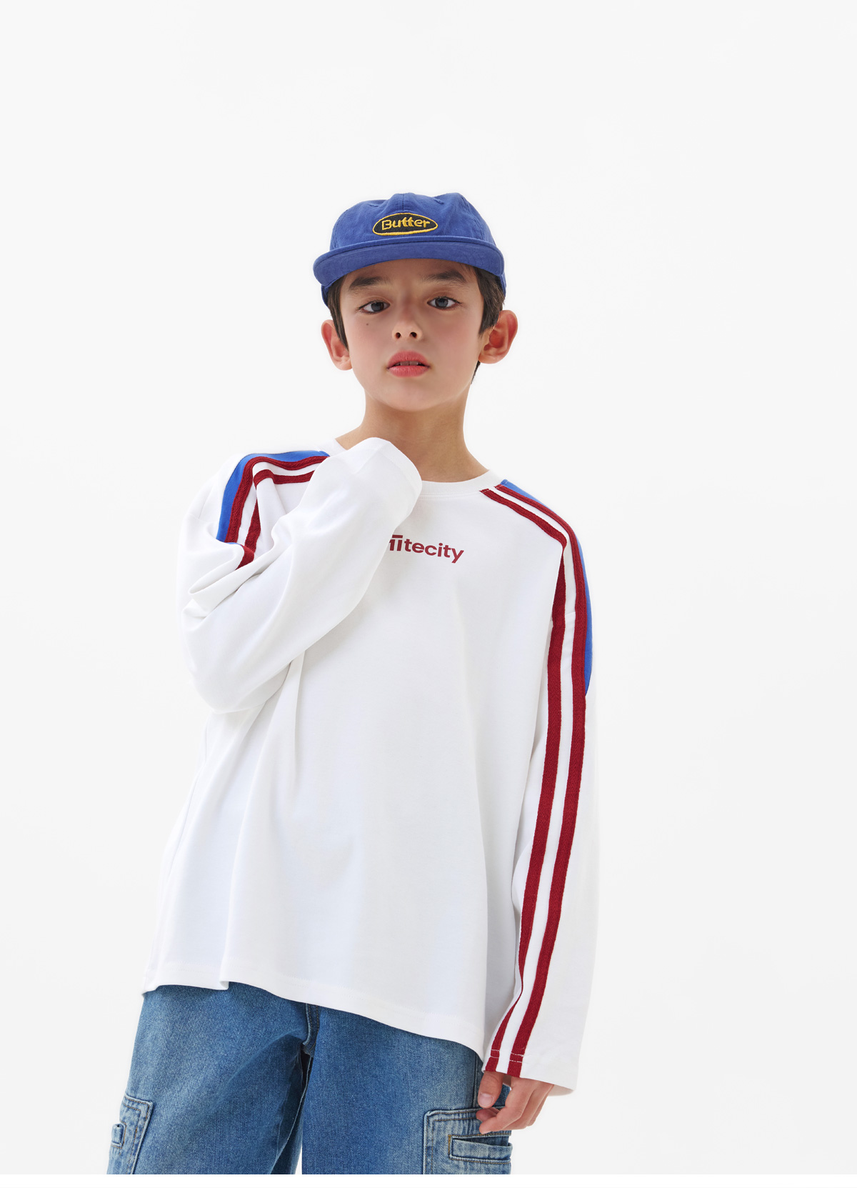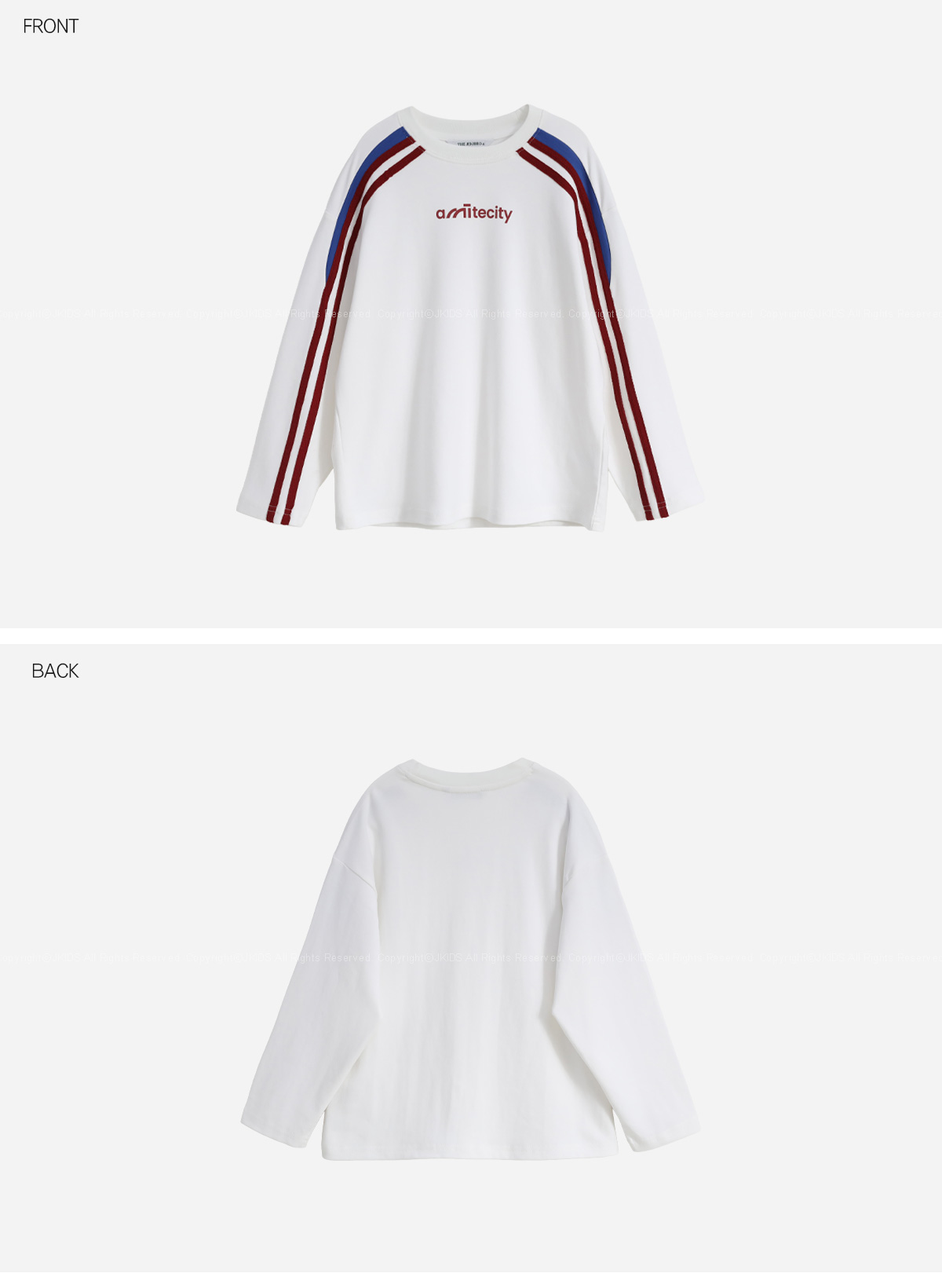 깔끔한 아이보리 바탕에 소매 라인 배색이 포인트가 되는 티셔츠예요.