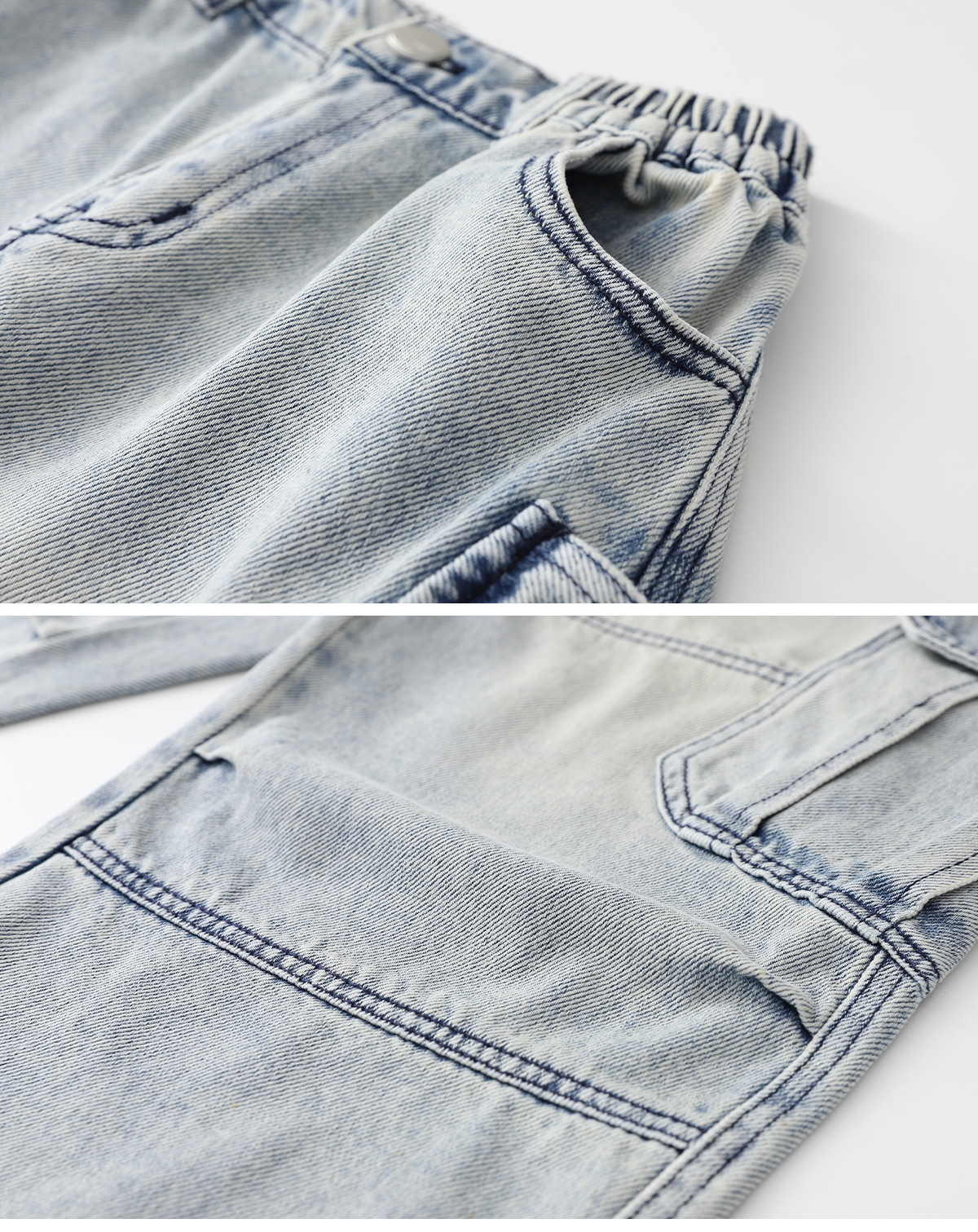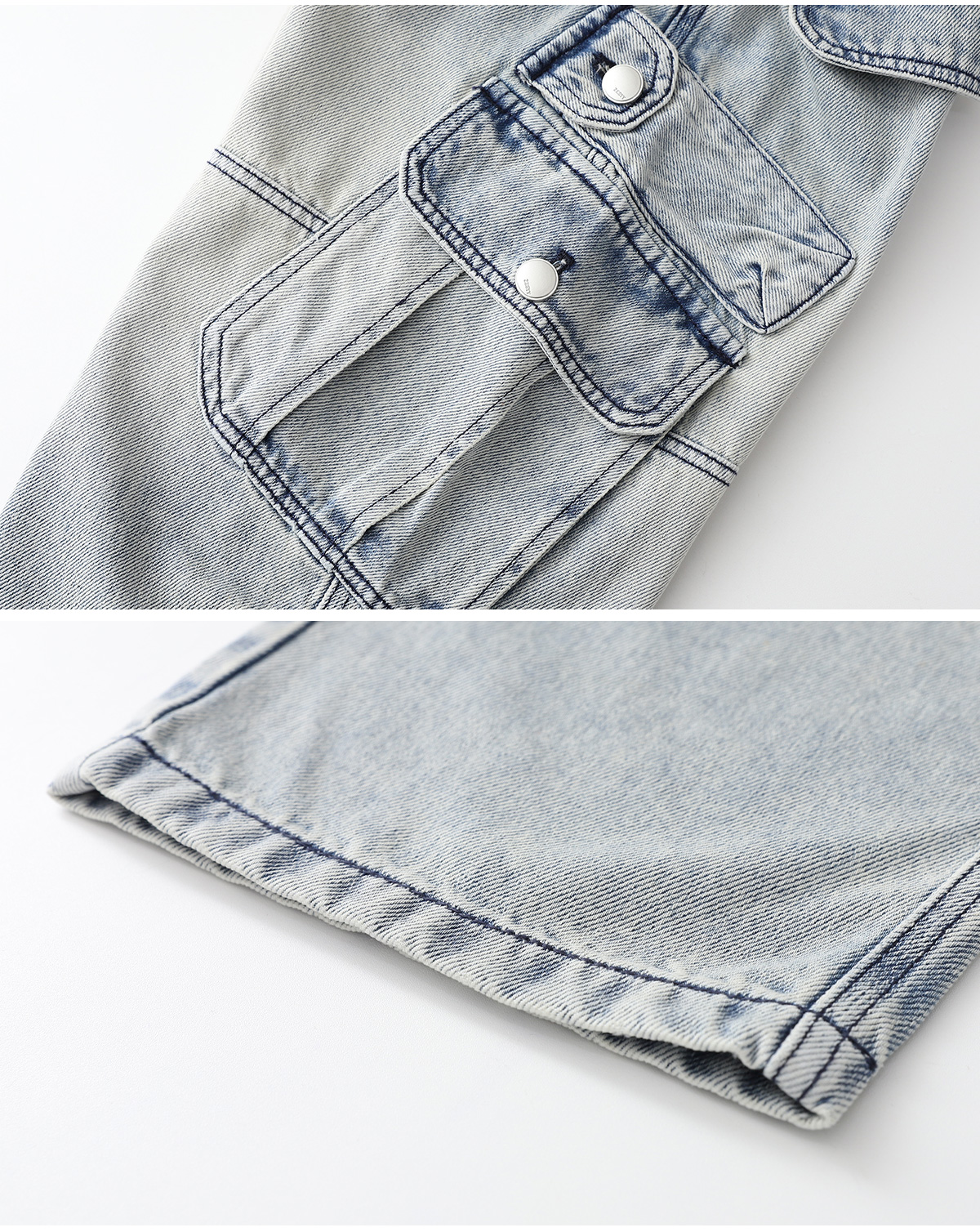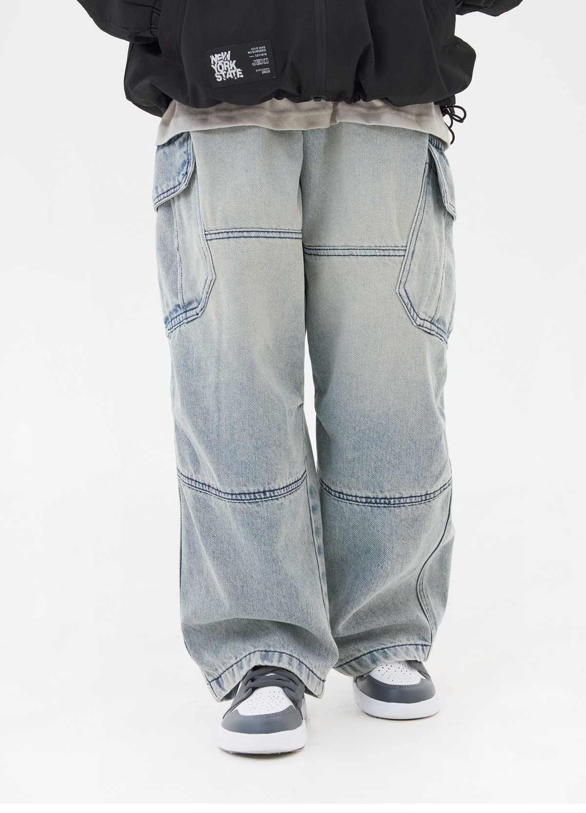 양쪽 빅포켓과 절개 디테일이 돋보이는 데님 팬츠예요
