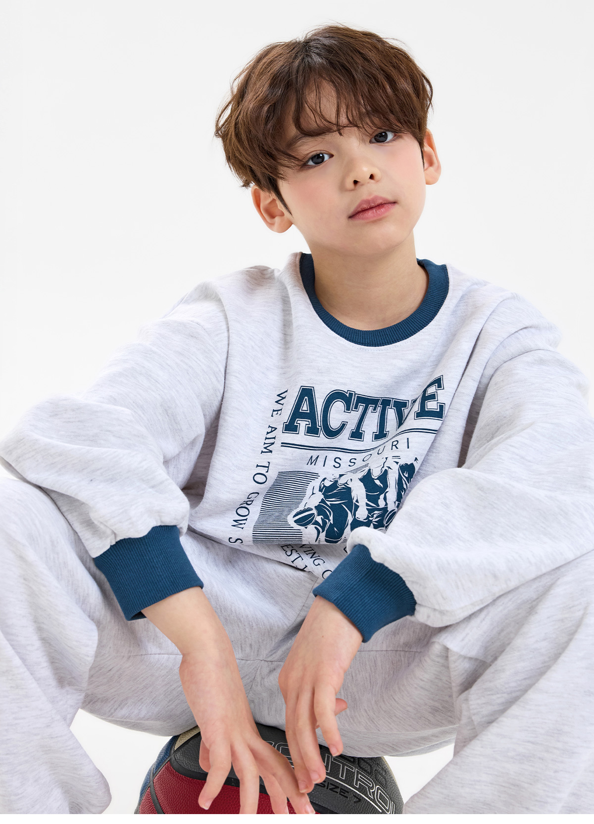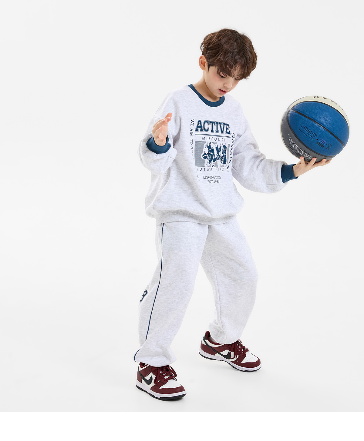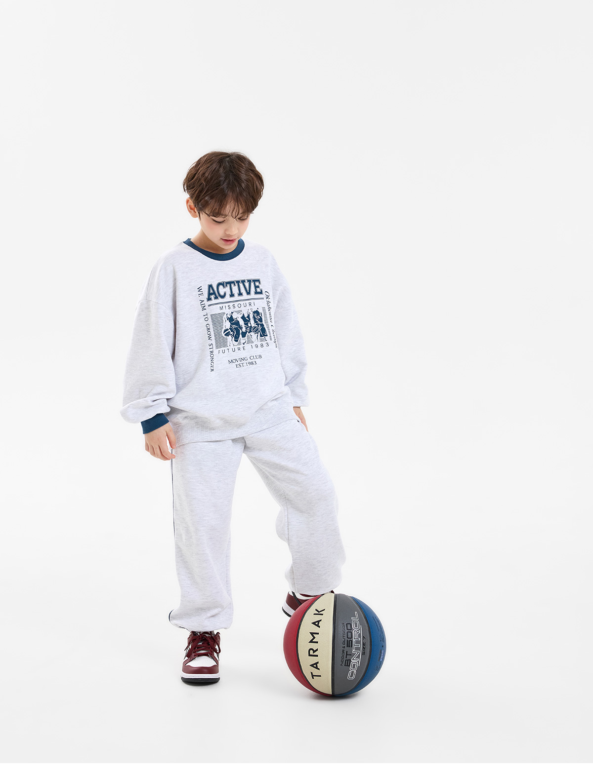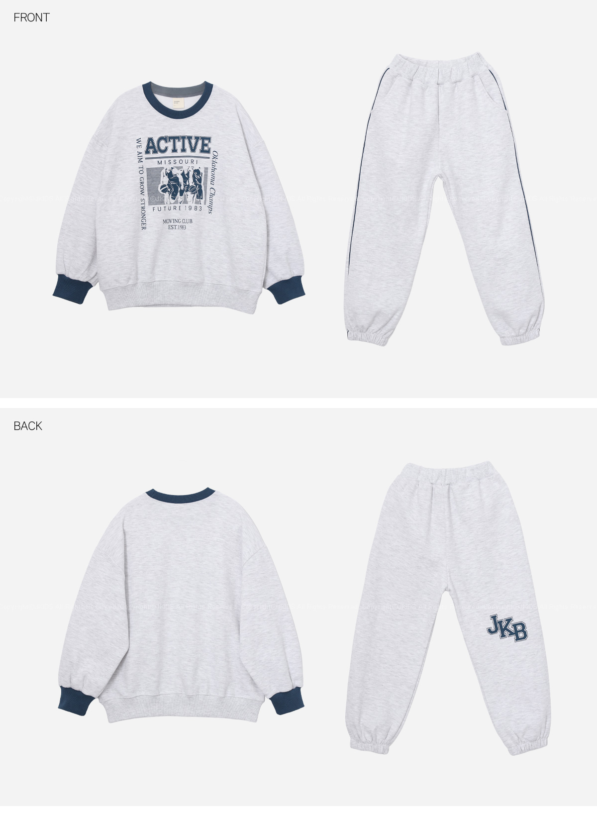 빈티지한 프린팅 포인트가 매력적인 맨투맨과 조거팬츠로 구성된 상하셋업이에요.