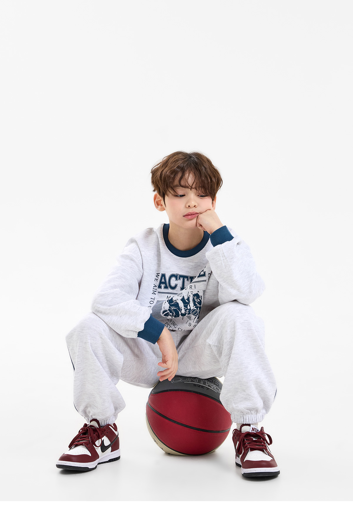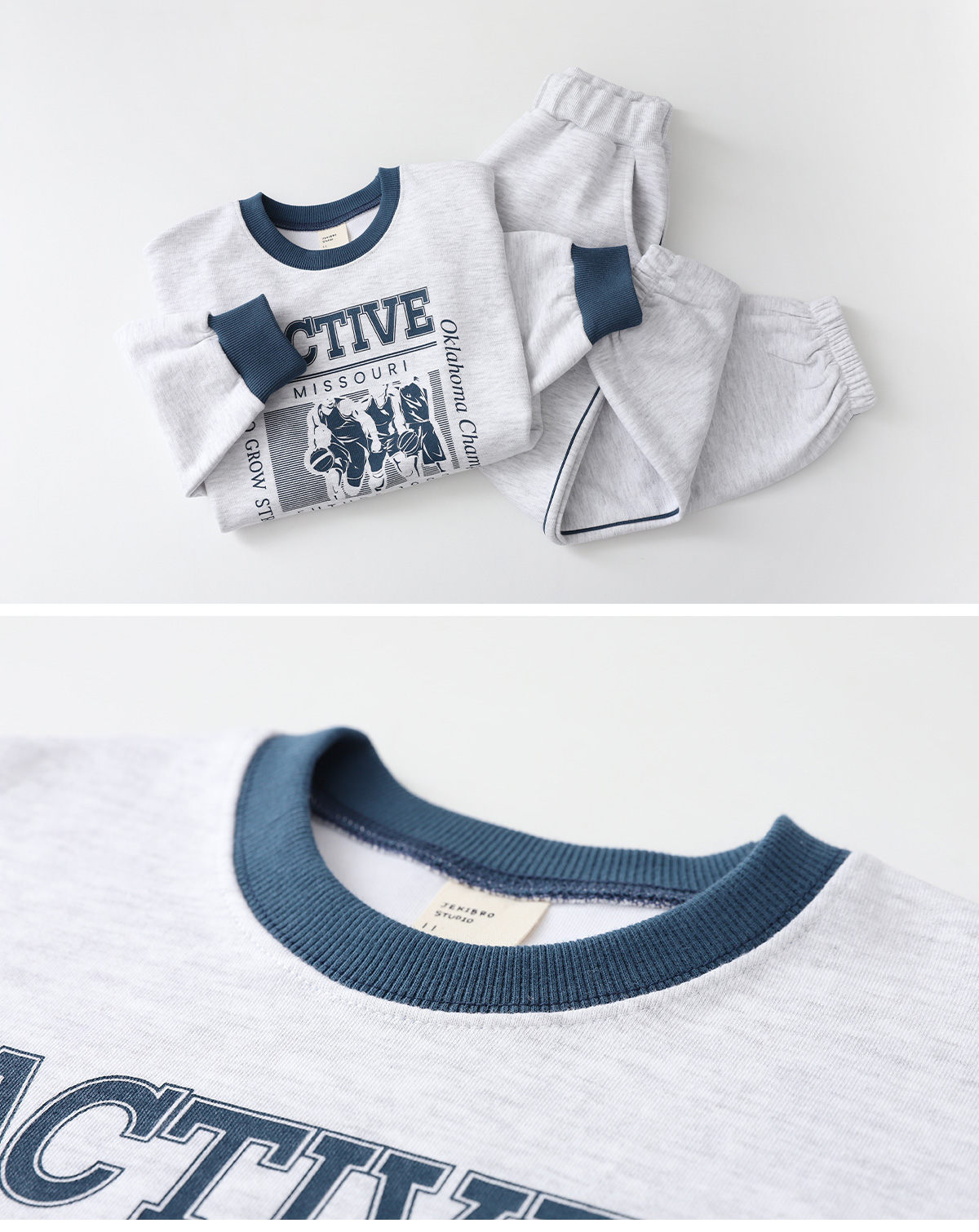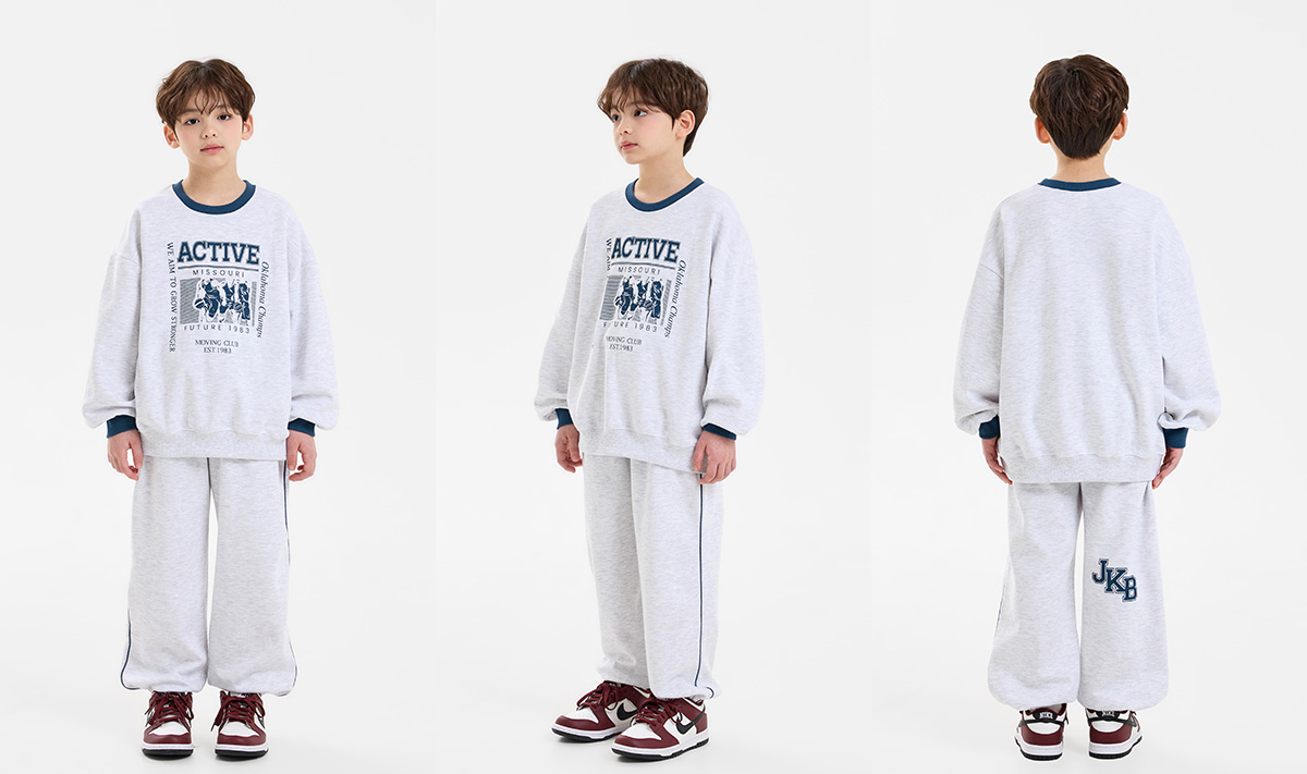 빈티지한 프린팅 포인트가 매력적인 맨투맨과 조거팬츠로 구성된 상하셋업이에요.