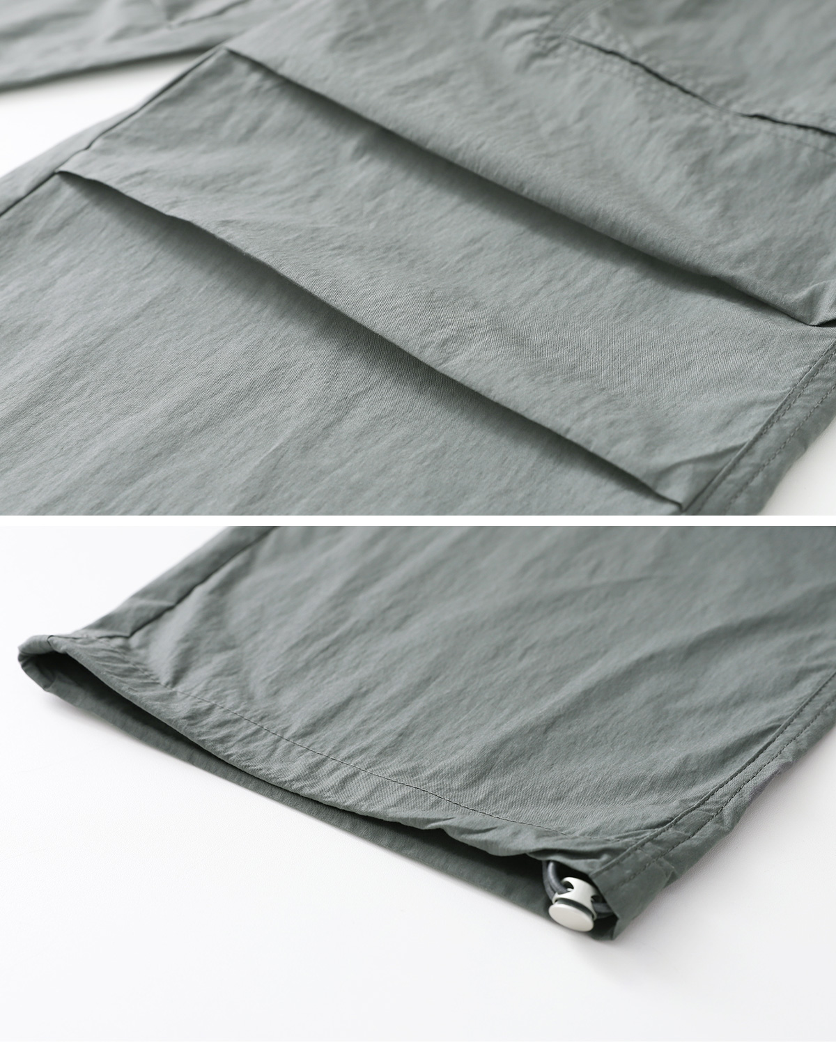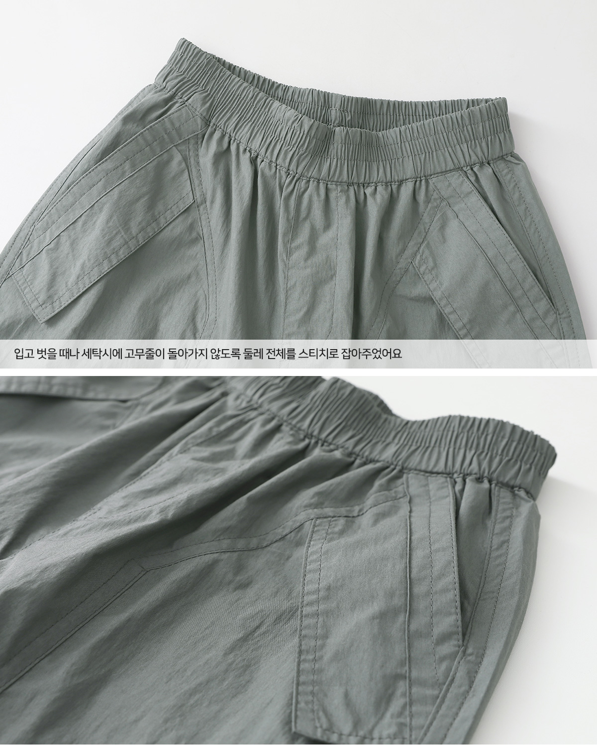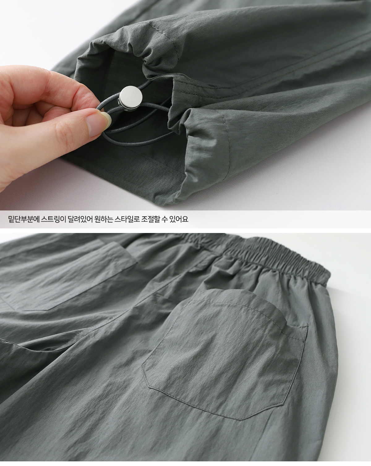 무릎부분 주름 잡은 디테일이 돋보이는 우븐 팬츠예요
