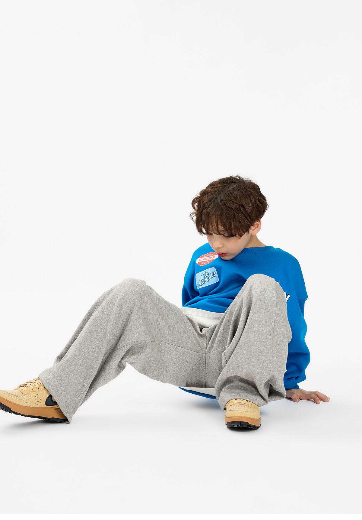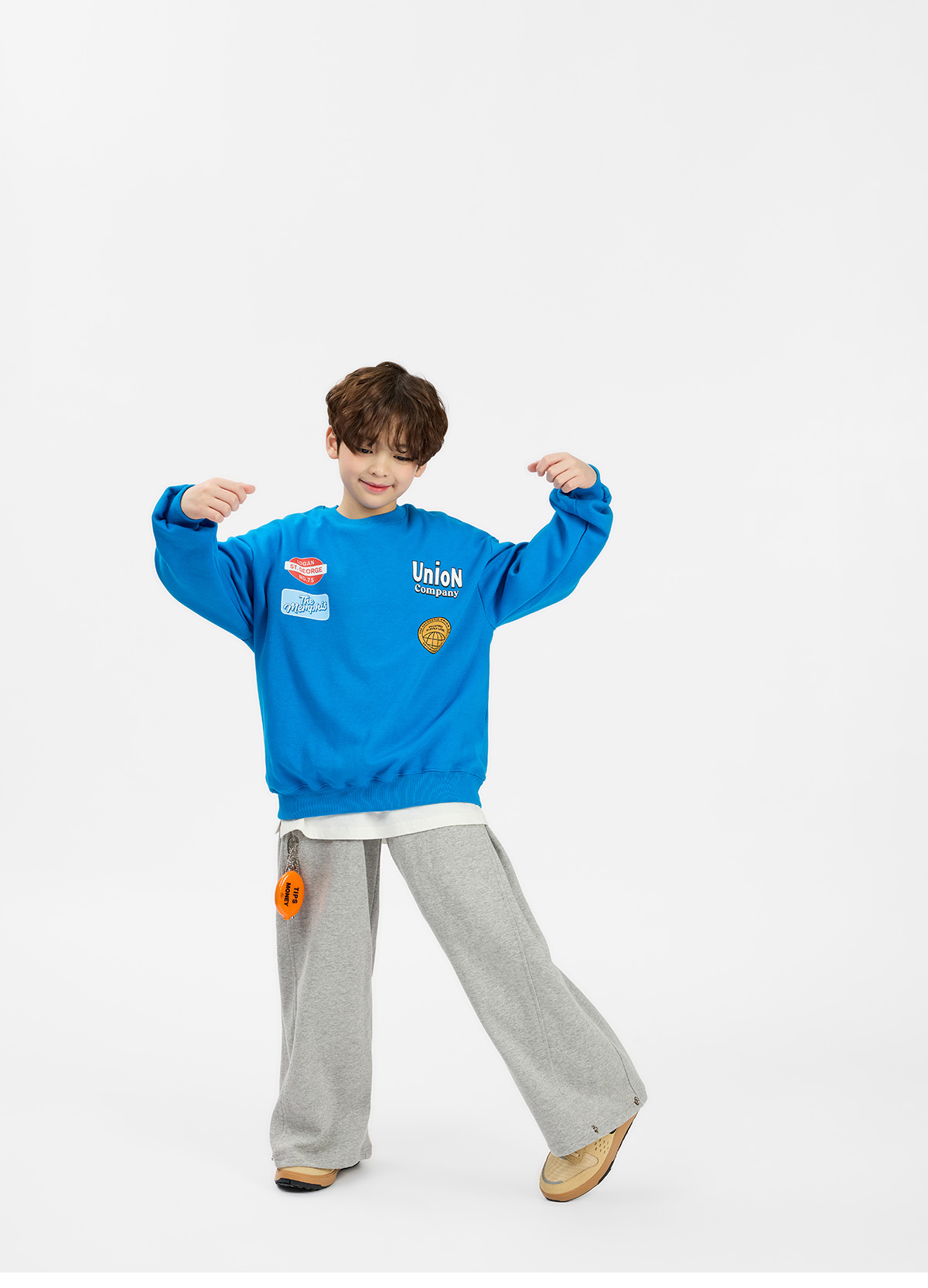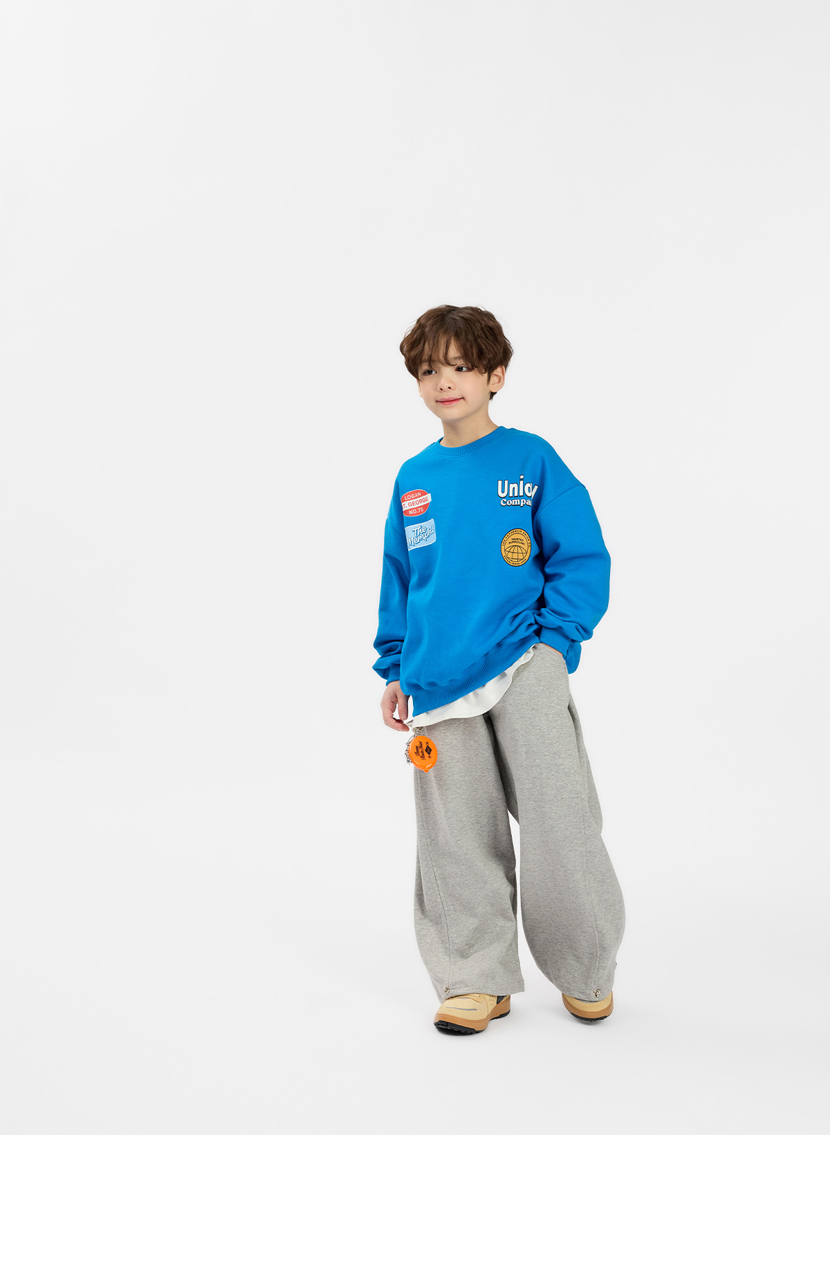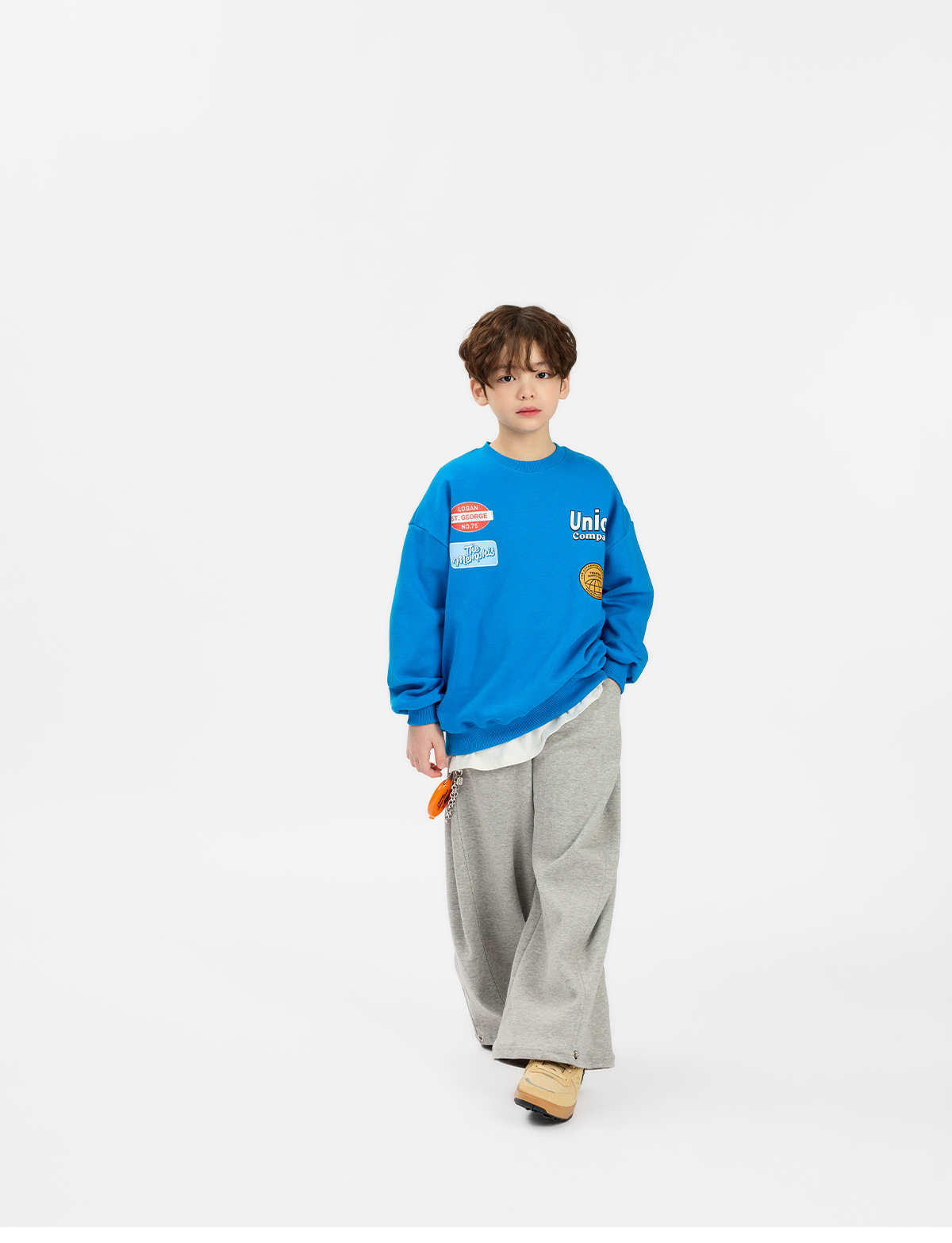 선명한 블루 컬러에 패치 프린팅 포인트를 더해 경쾌한 분위기가 살아 있는 맨투맨이에요.
