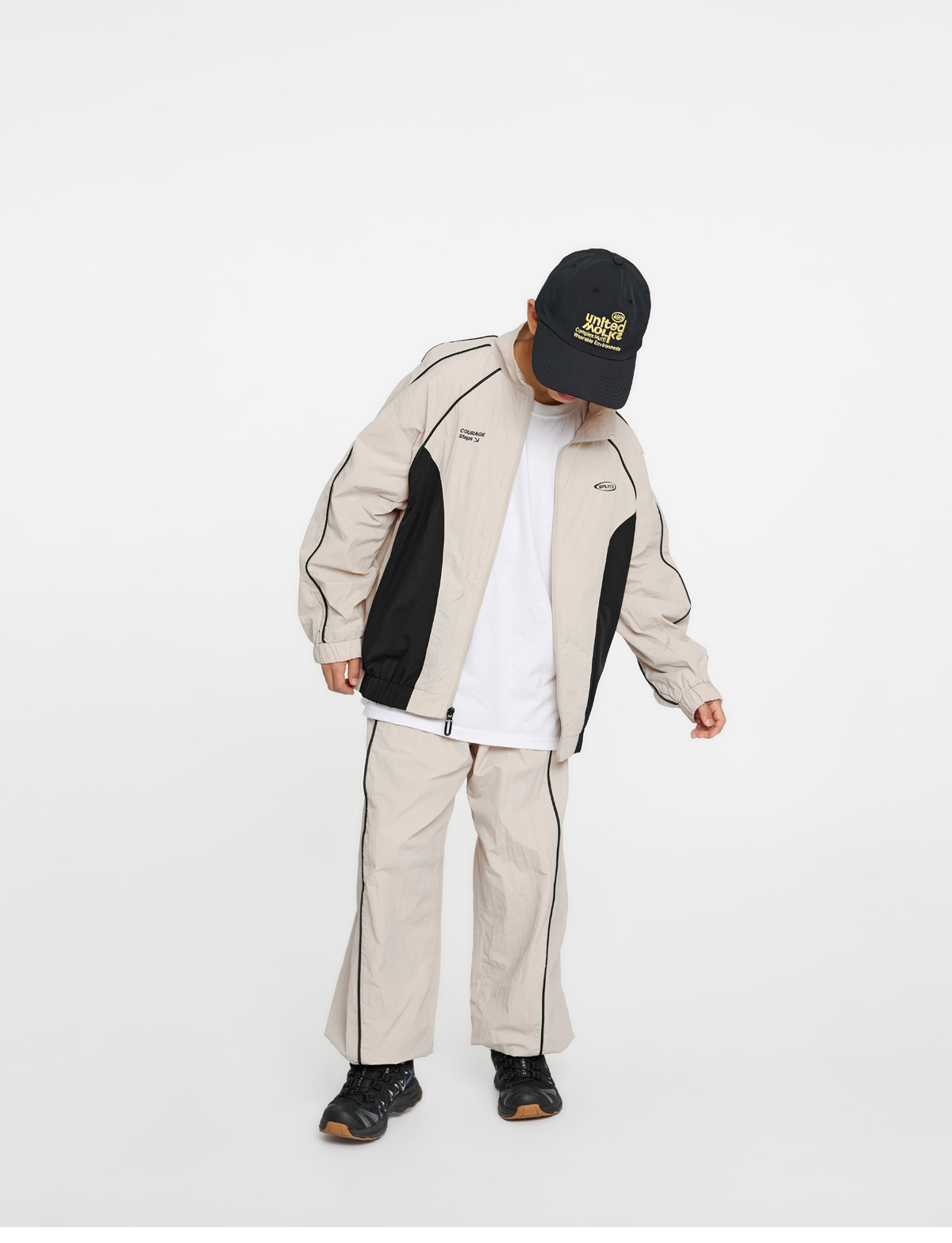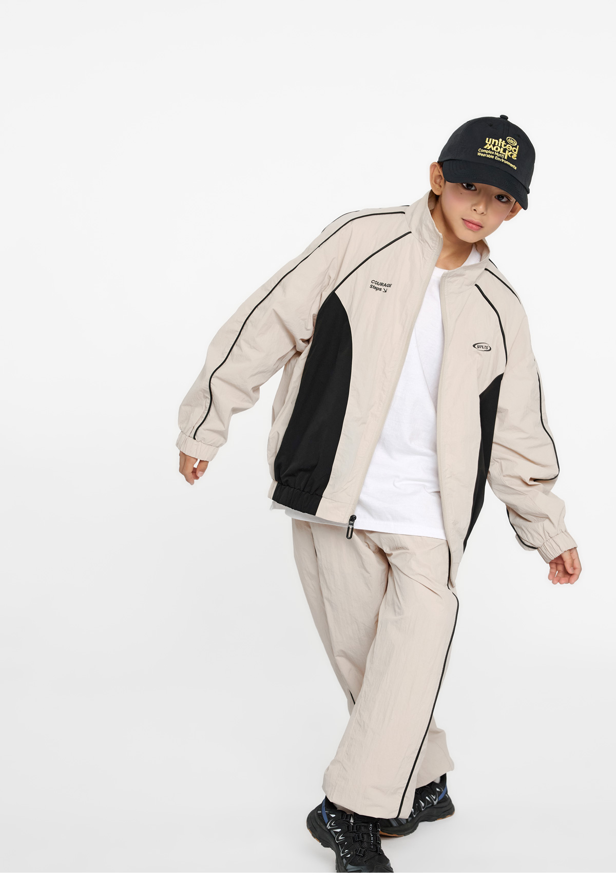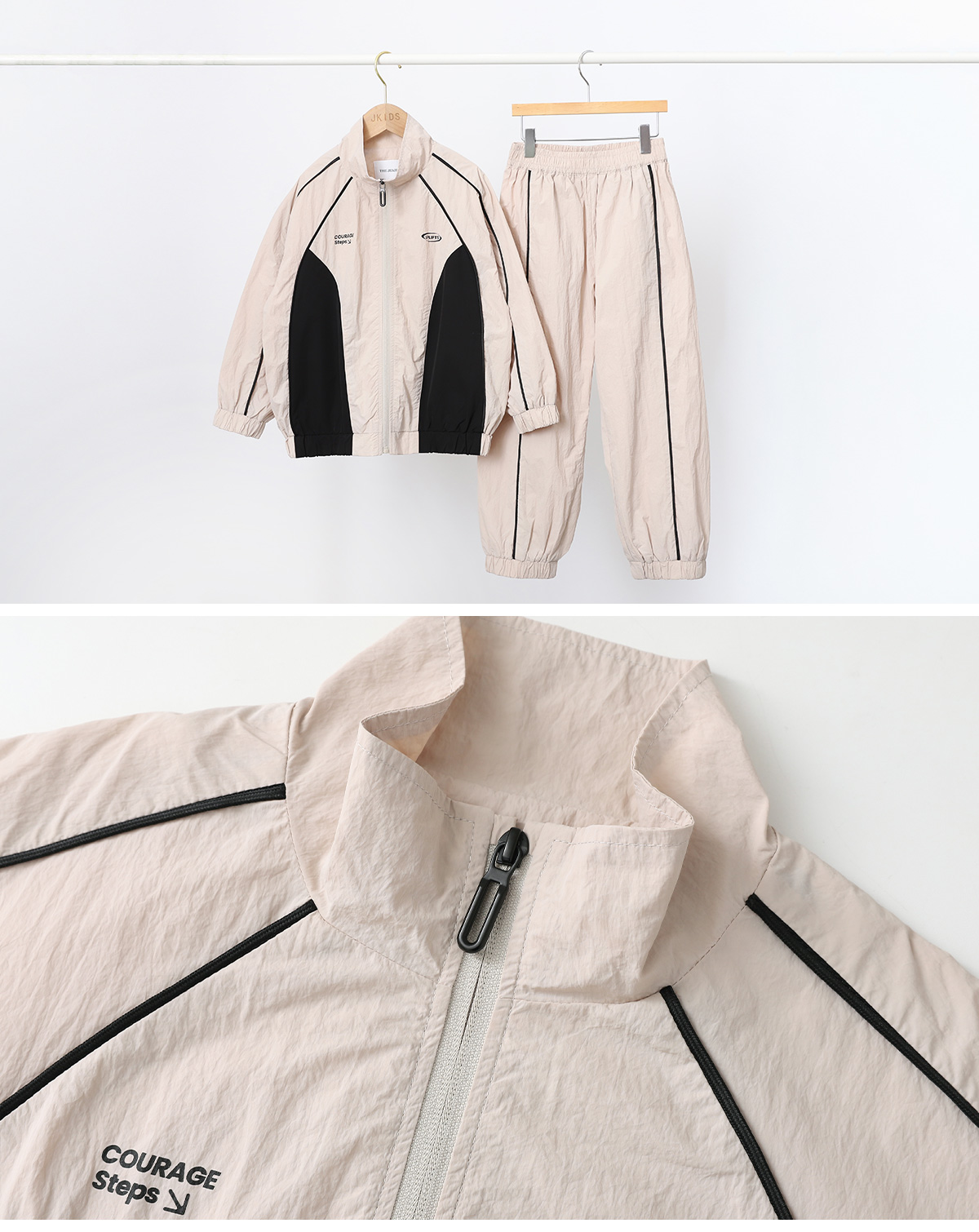 연베이지 컬러의 우븐 집업 상하세트예요.