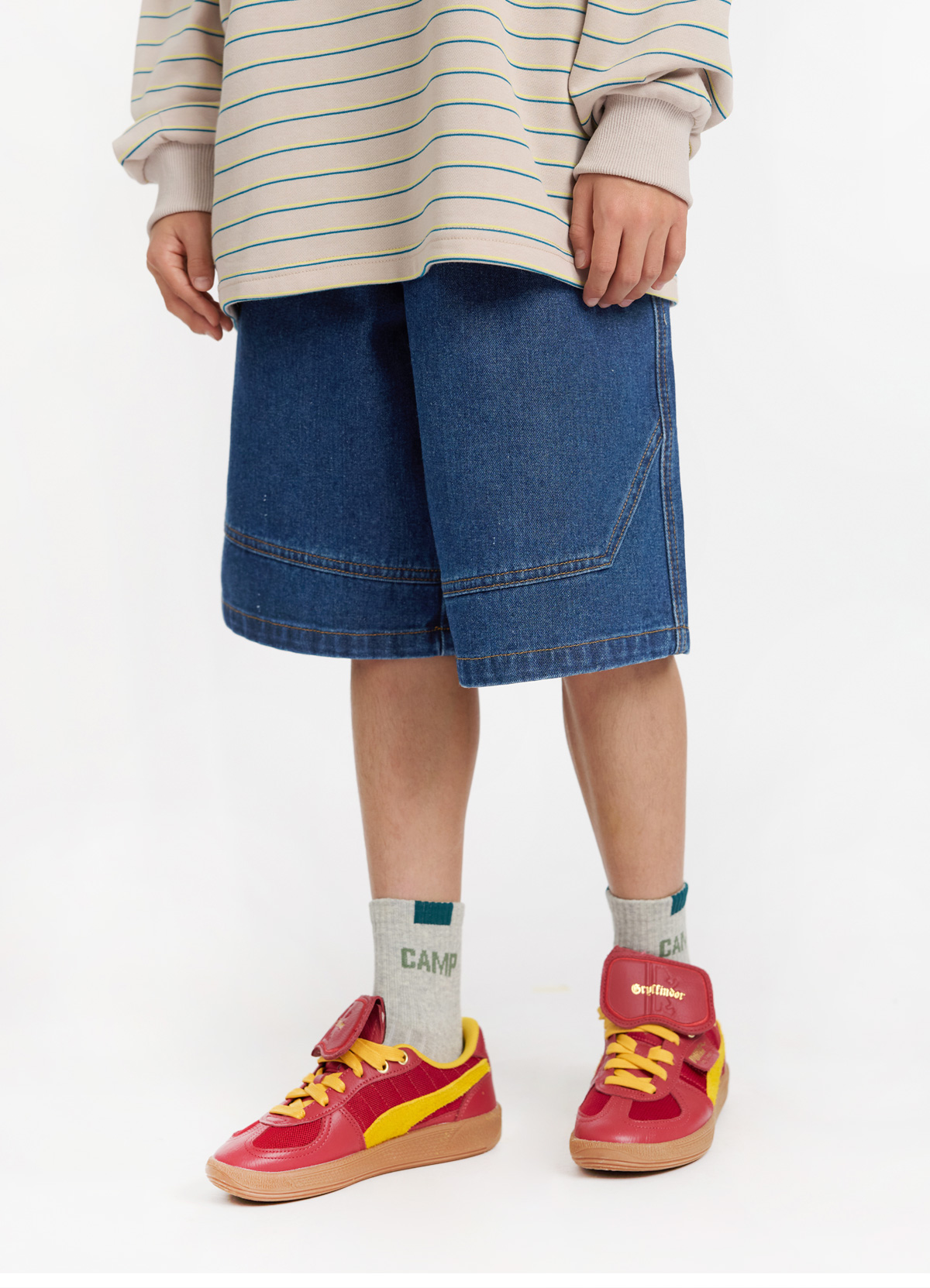 절개 스티치가 돋보이는 버뮤다 데님 팬츠예요