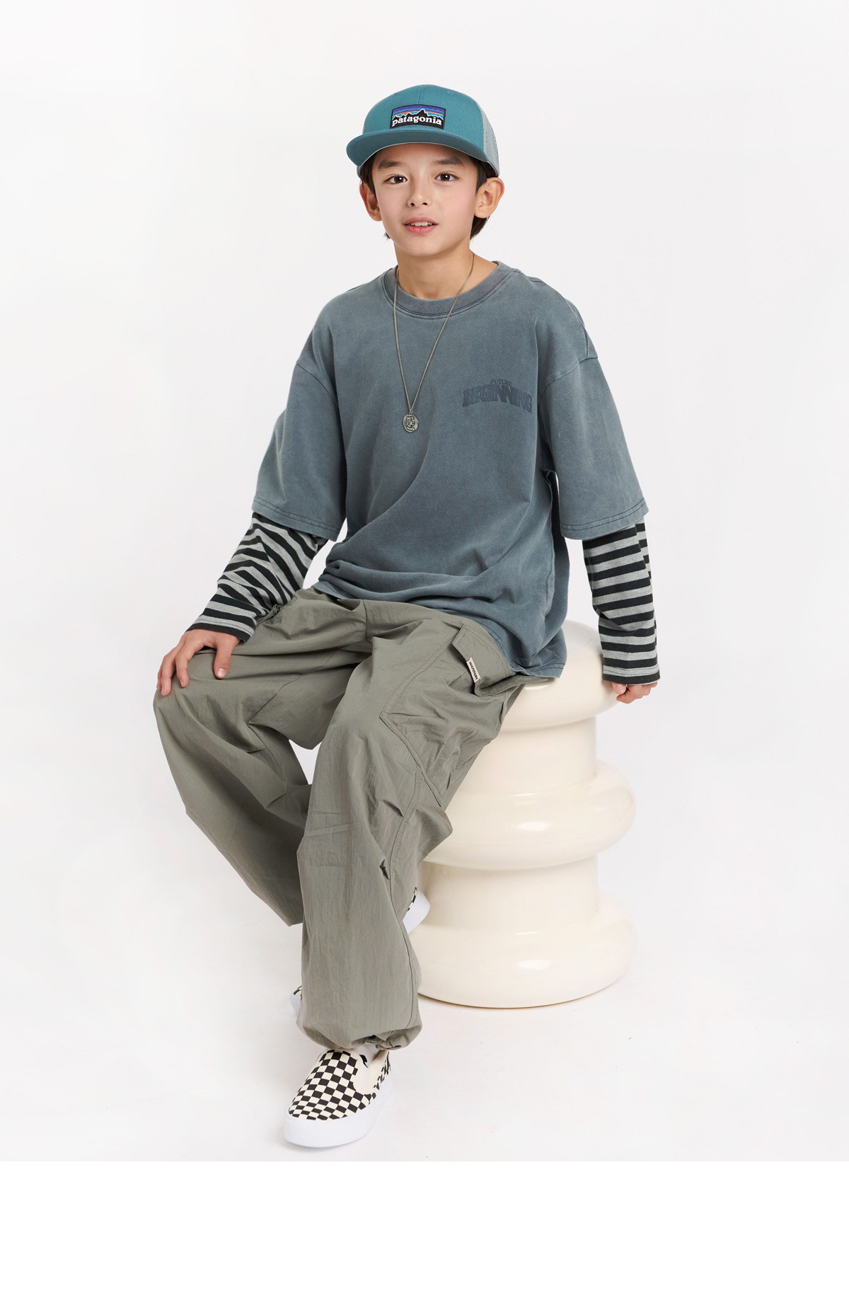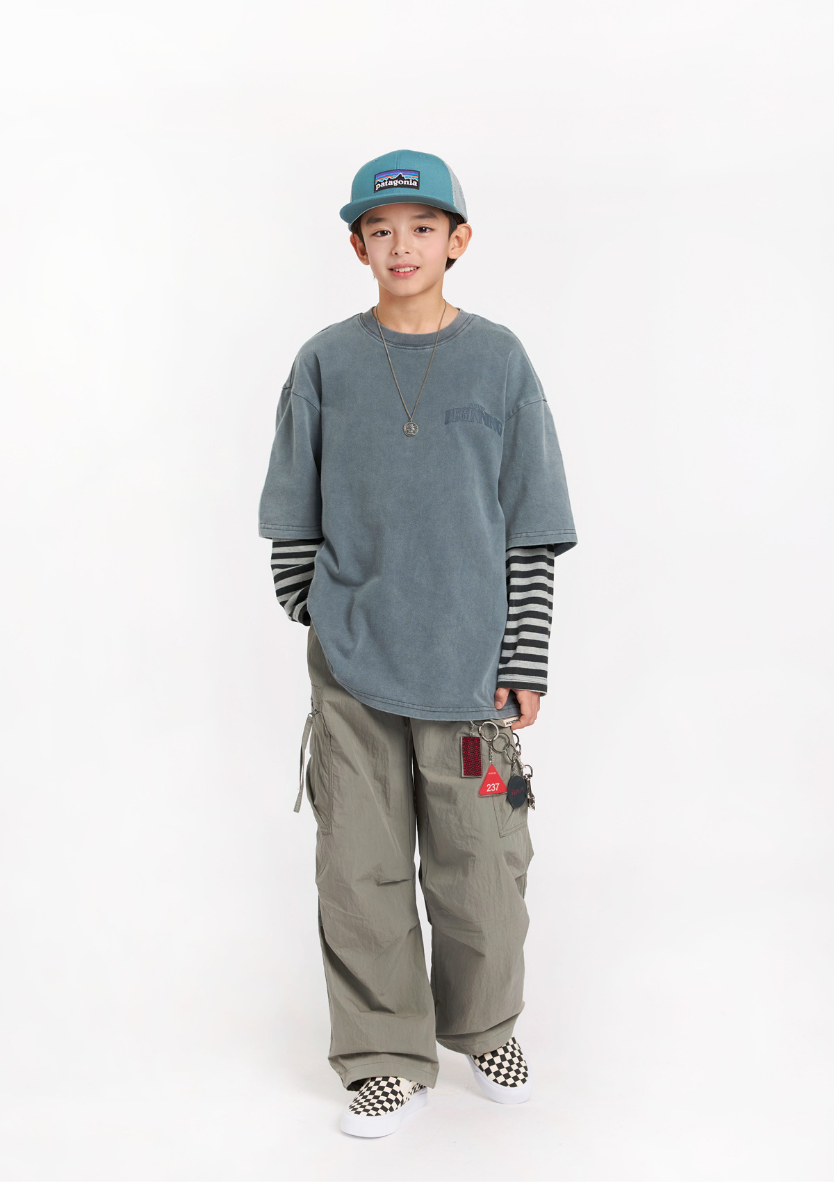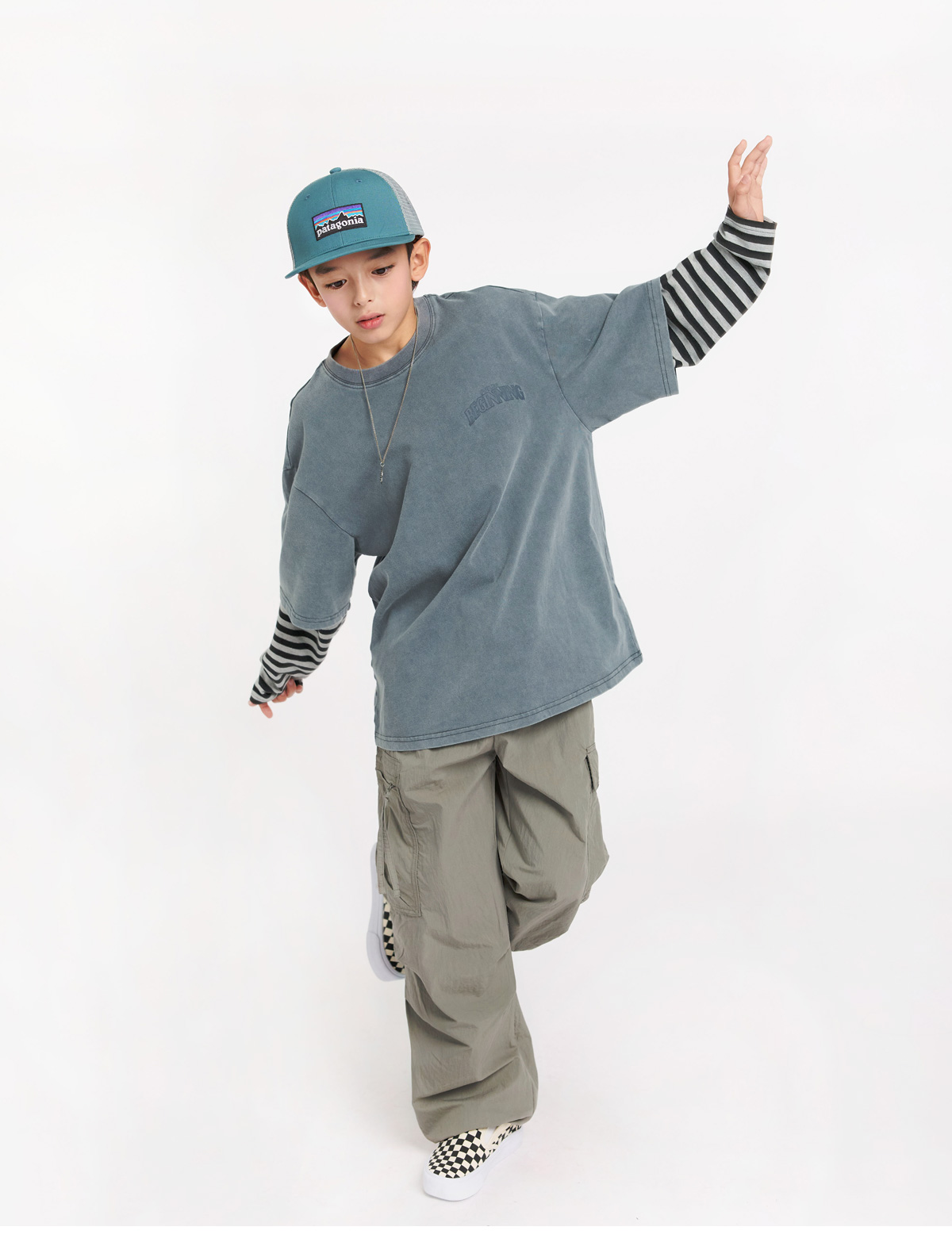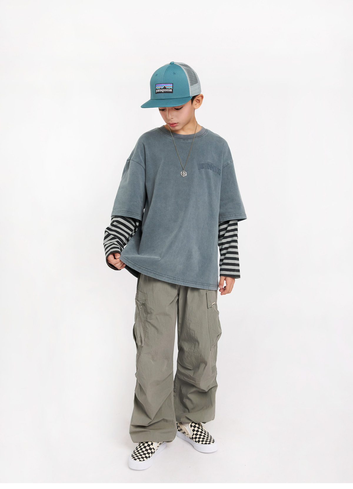 빈티지한 워싱 컬러감에 스트라이프 소매가 돋보이는 레이어드 티셔츠예요